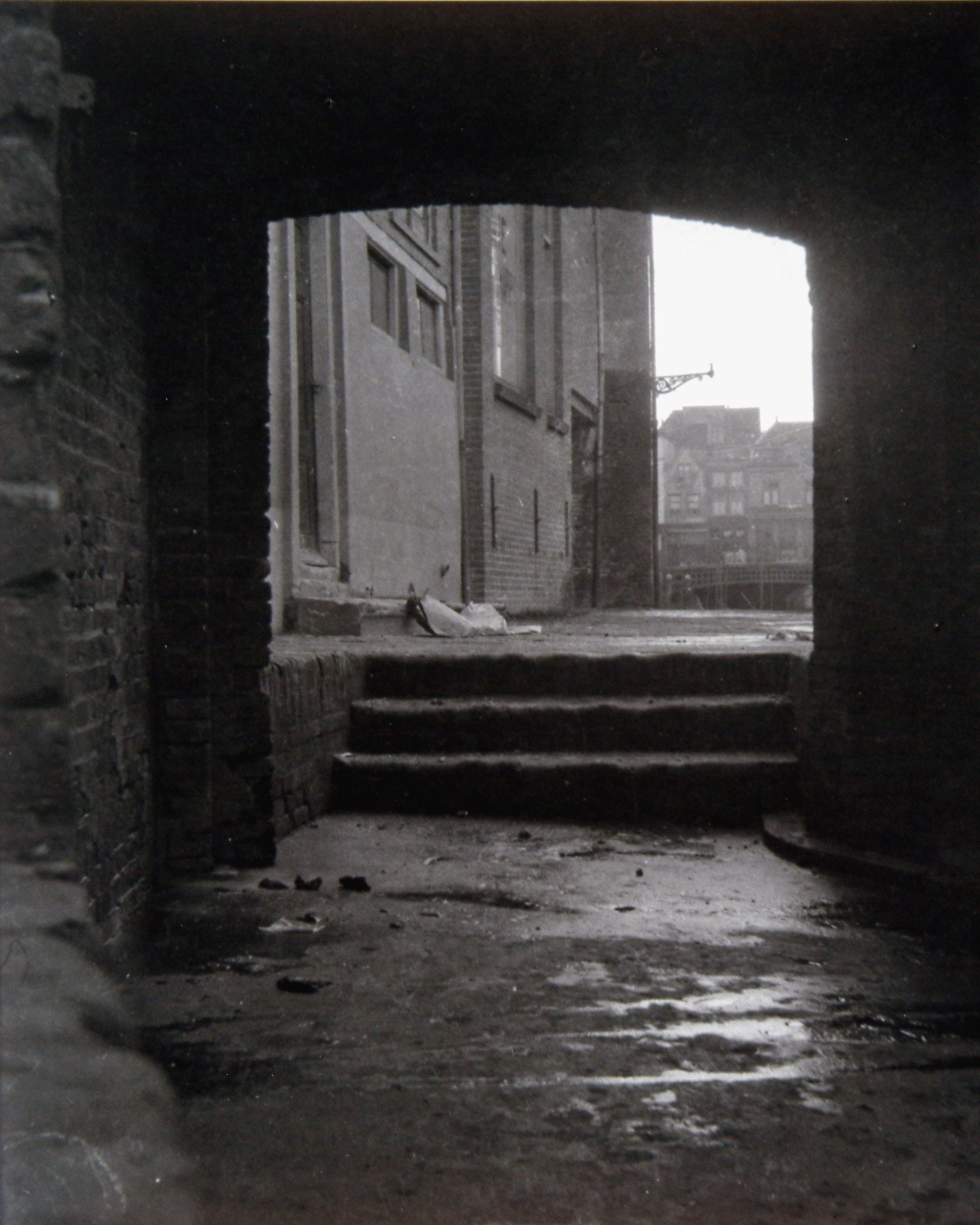- Onderdoorloop van de Wijnbrug aan de kant van de Voorstraat, kijkend in de richting van het Scheffersplein. Via de donkere gang links kon men op de Voorstraat komen