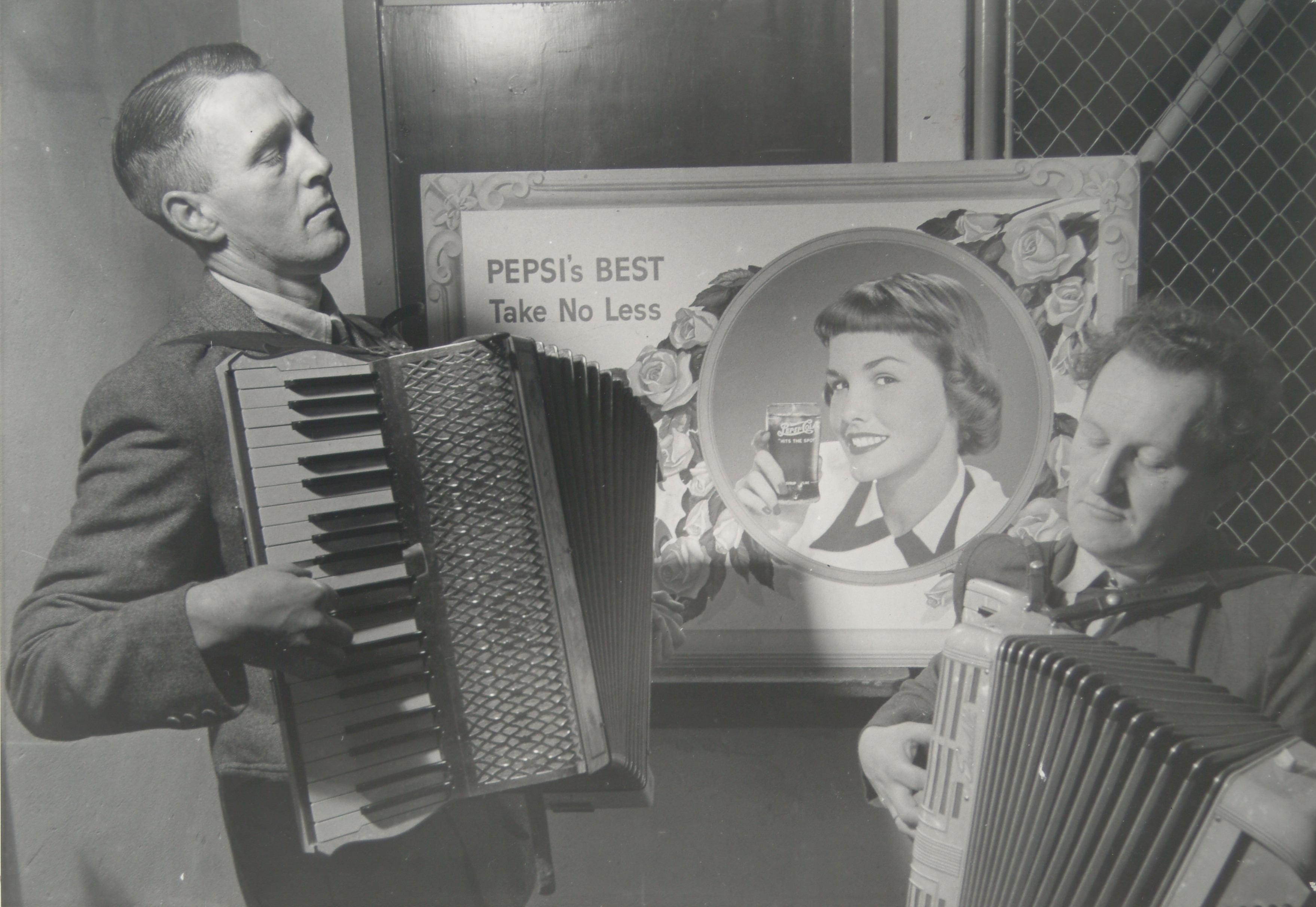 - Twee accordeonisten van de Chocolade- en biscuitfabriek Victoria aan de Korte Parallelweg voor een reclamebord Pepsi's Best, Take No Less