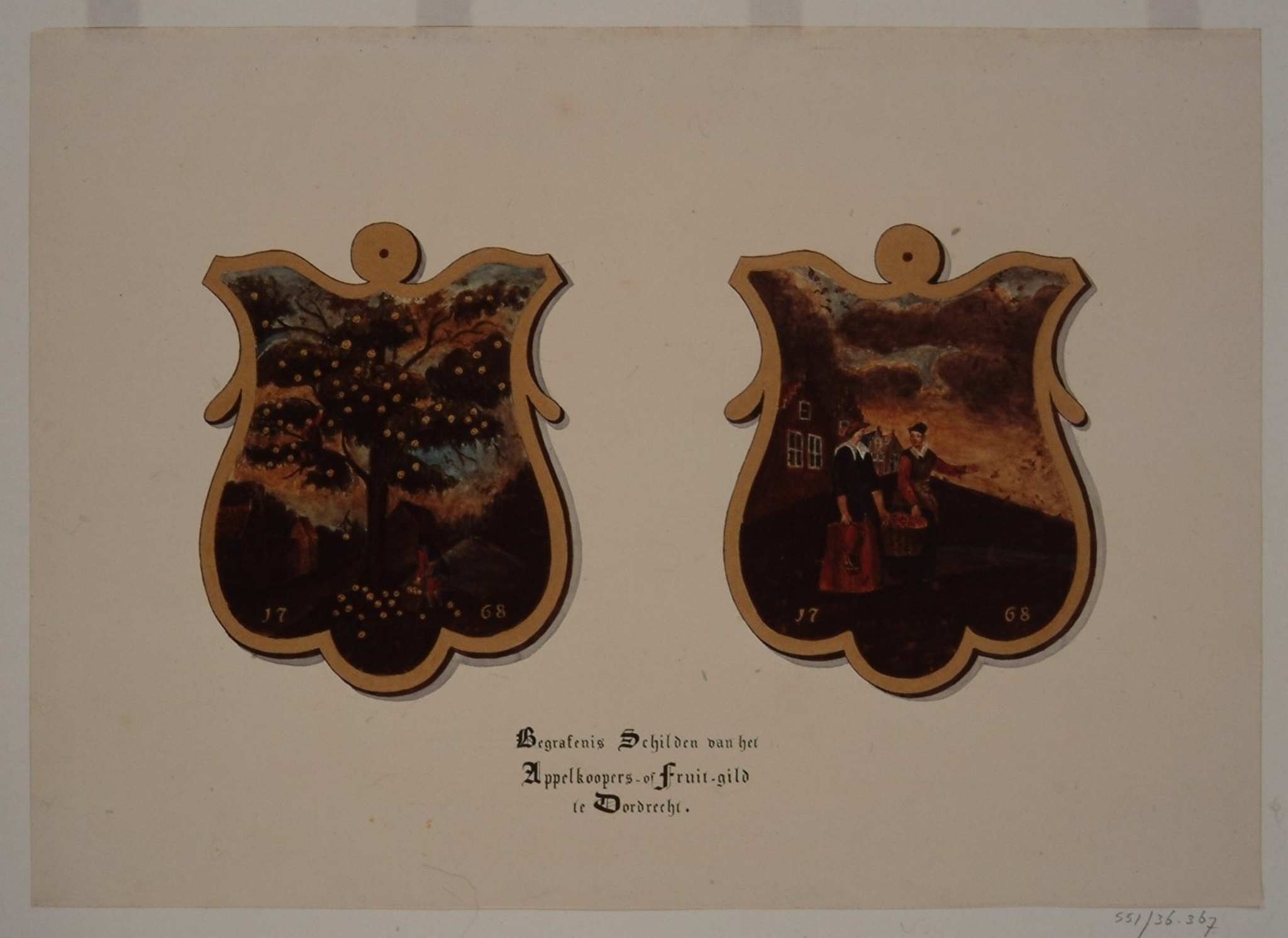 - Begrafenisschilden van het Appelkopers- of Fruit-gild te Dordrecht: afbeeldingen van Adam en Eva en voorstellingen betreffende de fruithandel, met jaartal 1768 en initialen van overheden of commissarissen