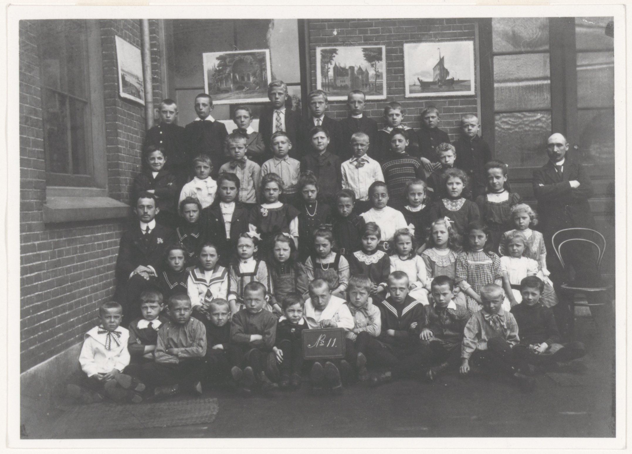Leerlingen en onderwijzers van Gemeenteschool nr. 11 voor lager onderwijs aan de noordzijde van het Geldelozepad. Lagere schoolklas poserend op de binnenplaats van een schoolgebouw, een leerling houdt een leitje vast met no. 11 (klas 2?, school 11?); verder 2 onderwijzers van wie er één mogelijk Kruythof heet.