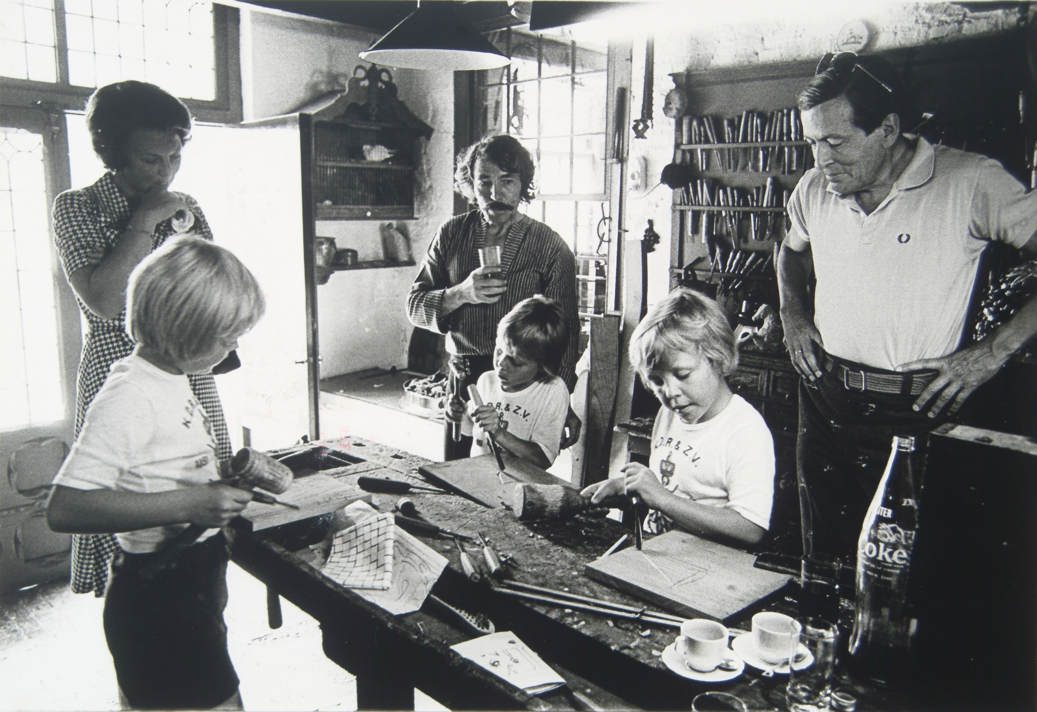 Het prinselijk gezin op bezoek in het atelier van beeldhouwer Bert Stoop aan de …