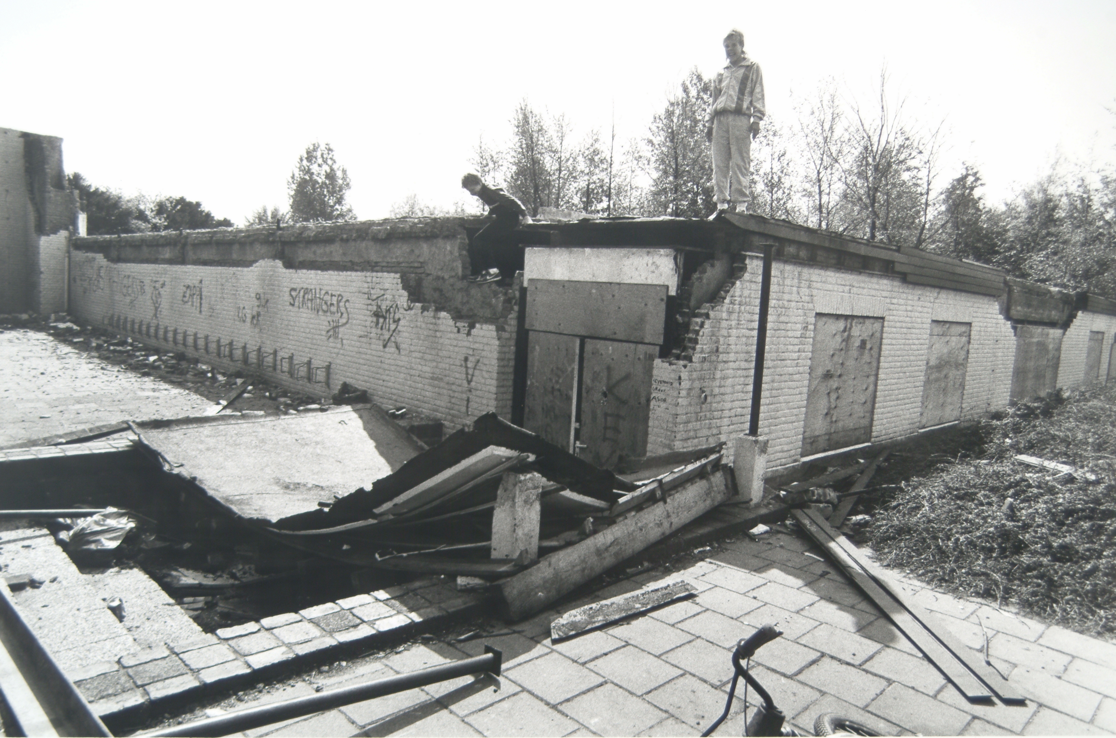 Overblijfselen van het uitgebrande Sportfondsenbad aan de Brandts Buysstraat