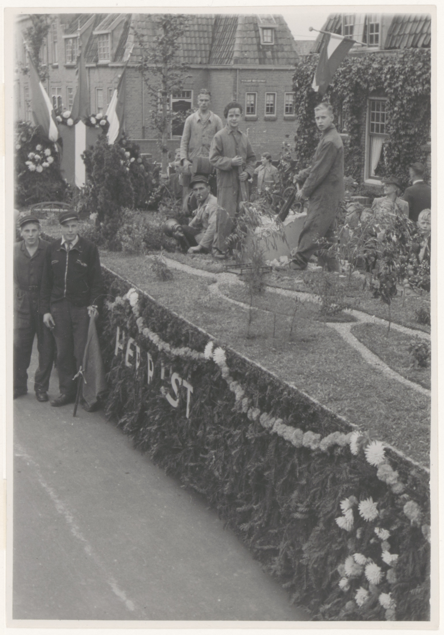 - Praalwagen van de dienst Openbare Werken in een optocht ter gelegenheid van de herdenking van de bevrijding in 1945 bij de Nicolaas Beetsstraat met een voorstelling van plantsoenaanleg; op de zijkant van de wagen waarschijnlijk de tekst 'Merwesteijn herrijst'.