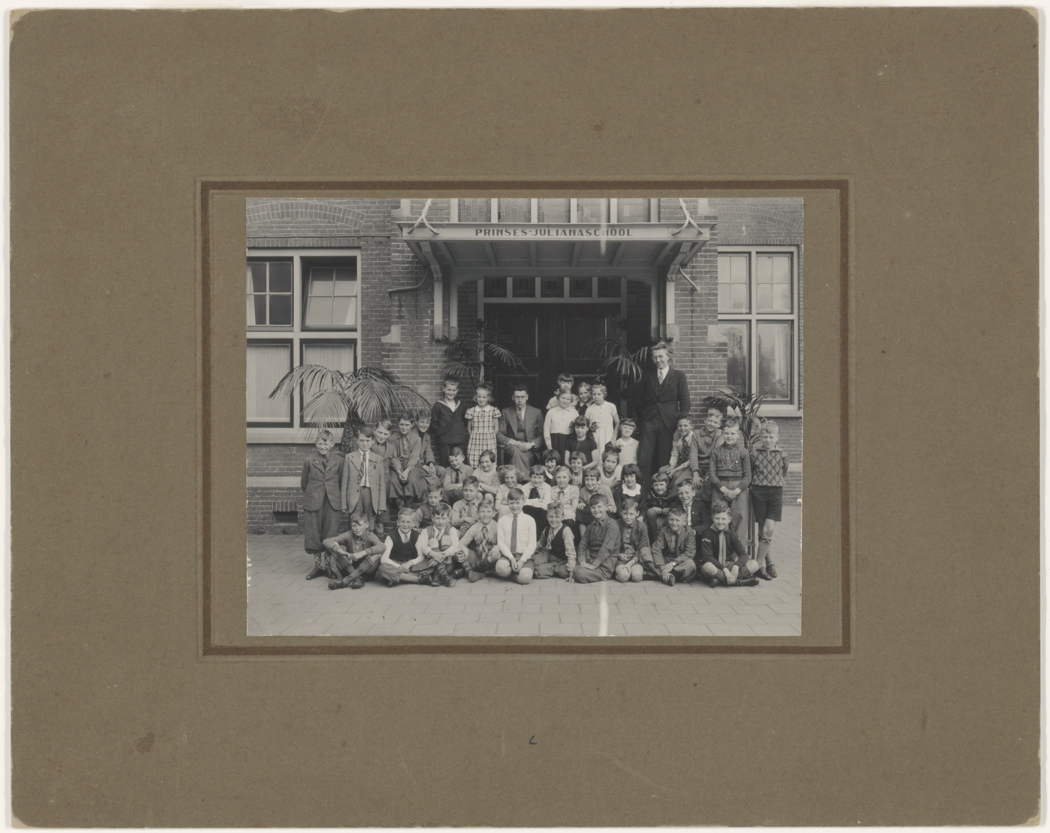 - Vierde klas van de protestantse lagere school, de Prinses Julianaschool, aan de Van Strijsingel voor de ingang van de school. De zittende man is onderwijzer J.W. Grundlehner, de staande jongeman kwekeling Visser; onderste rij 4e van links is dhr. W.J. van Daalen.