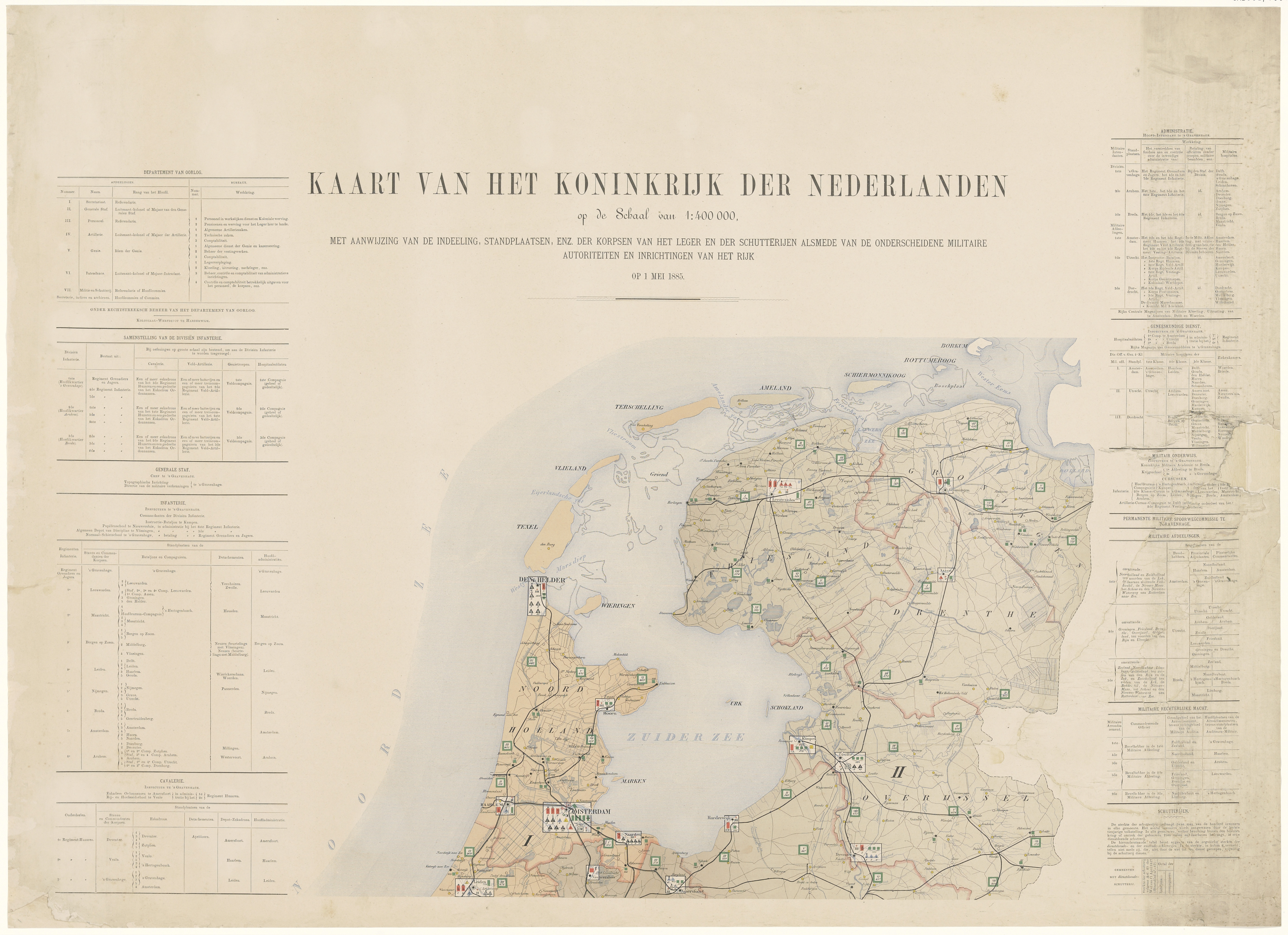 - Kaart van Nederland in 2 delen met de indeling en standplaatsen van de legerkorpsen en schutterijen.