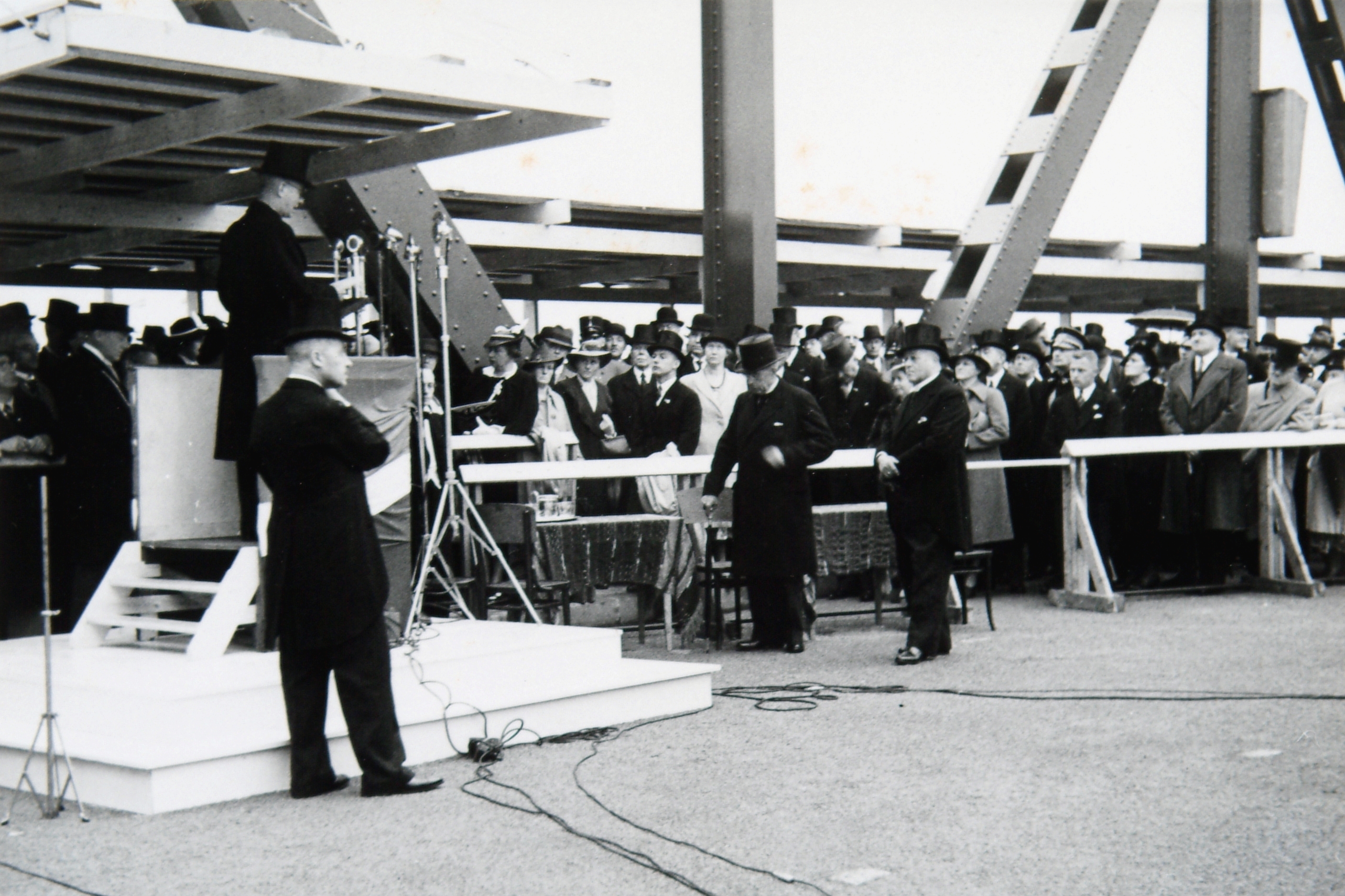 - Minister van Waterstaat mr.dr.ir. Van Buuren houdt een openingsrede bij de opening van de verkeersbrug over de Oude Maas. Er staat o.a. een microfoon van AVRO radio opgesteld.