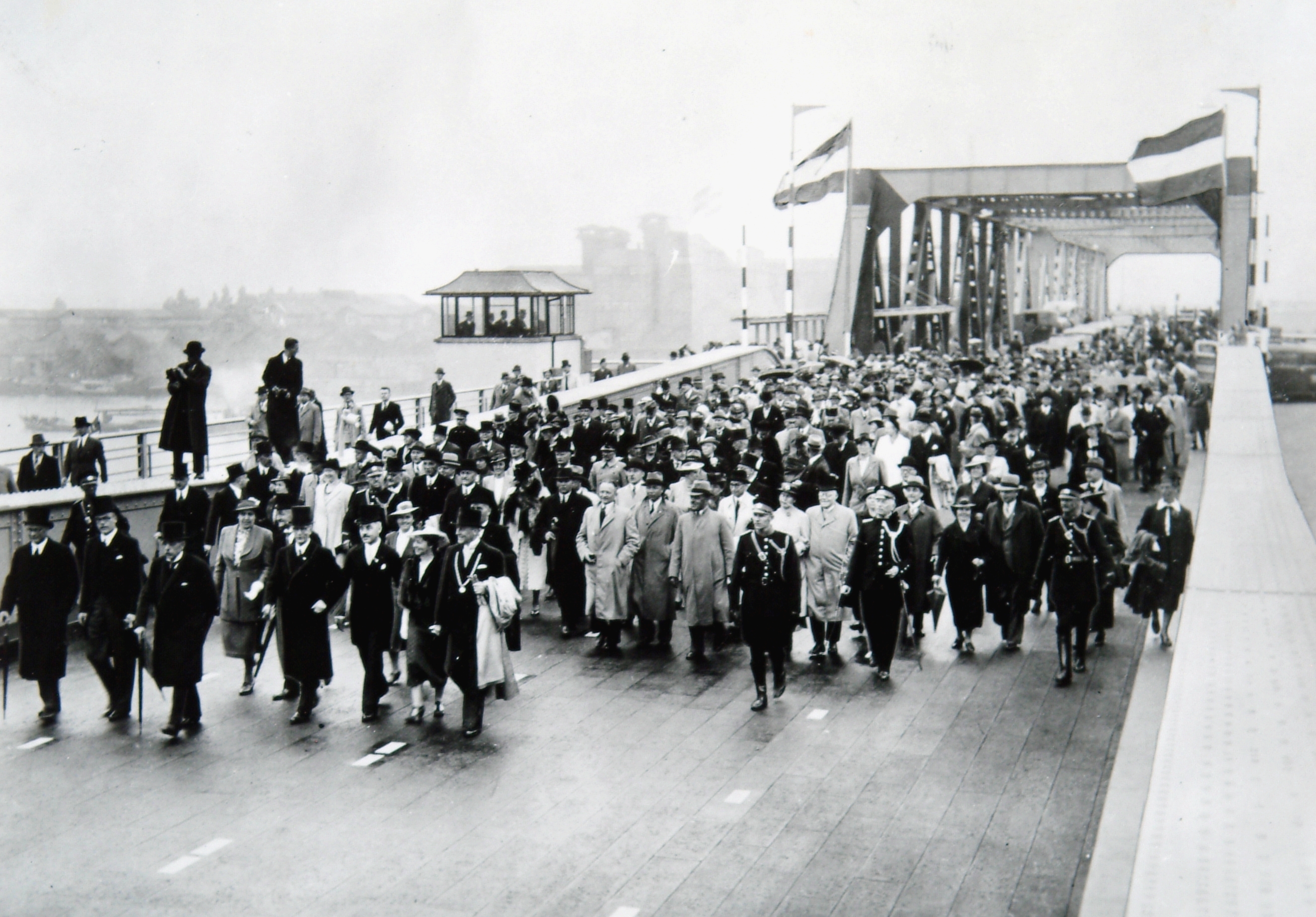- Notabelen met gevolg bij de opening van de verkeersbrug over de Oude Maas, gezien in de richting van Zwijndrecht.