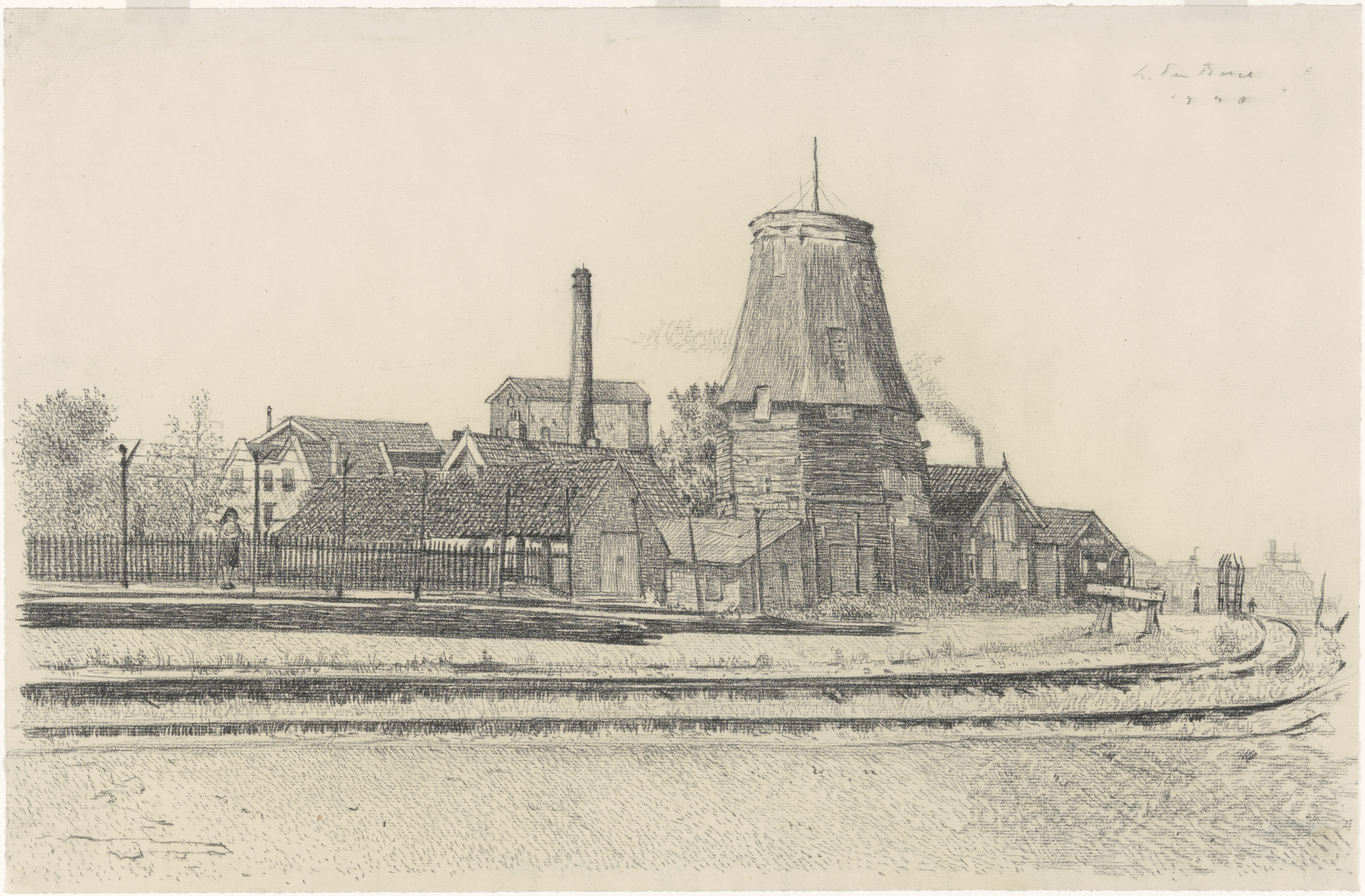 - De romp van de molen "De Pelikaan"op de noordelijke hoek van de 's-Gravendeelse dijk en de weeskinderendijk, met omgeving gezien uit het Noorden.
