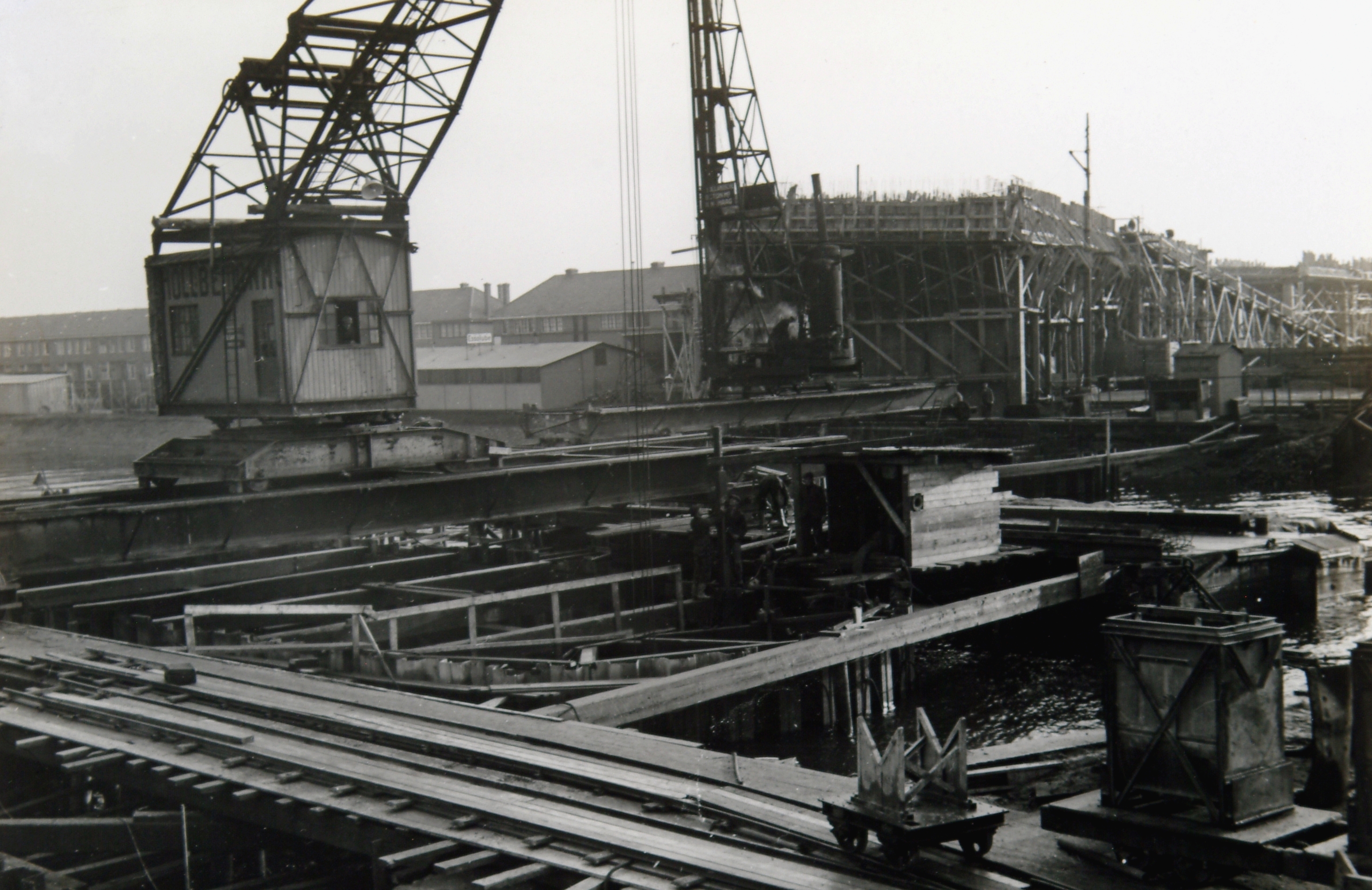 - Bouw van een pijler voor de oprit van de verkeersbrug over de Oude Maas in de Spoorweghaven, gezien richting Weeskinderendijk.