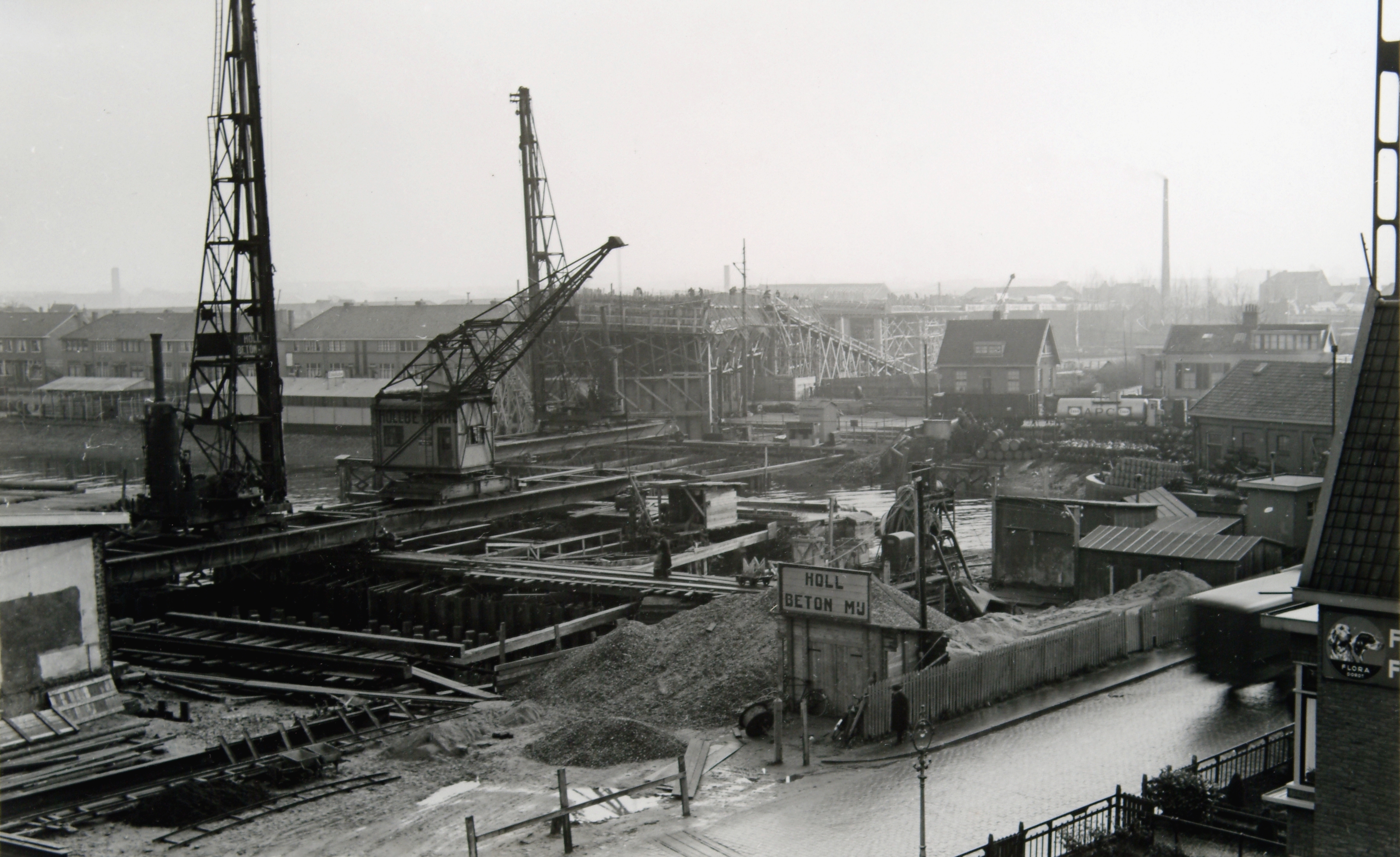 - Bouw van een pijler voor de oprit van de verkeersbrug over de Oude Maas in de Spoorweghaven, gezien vanaf de Dokweg richting Weeskinderendijk.