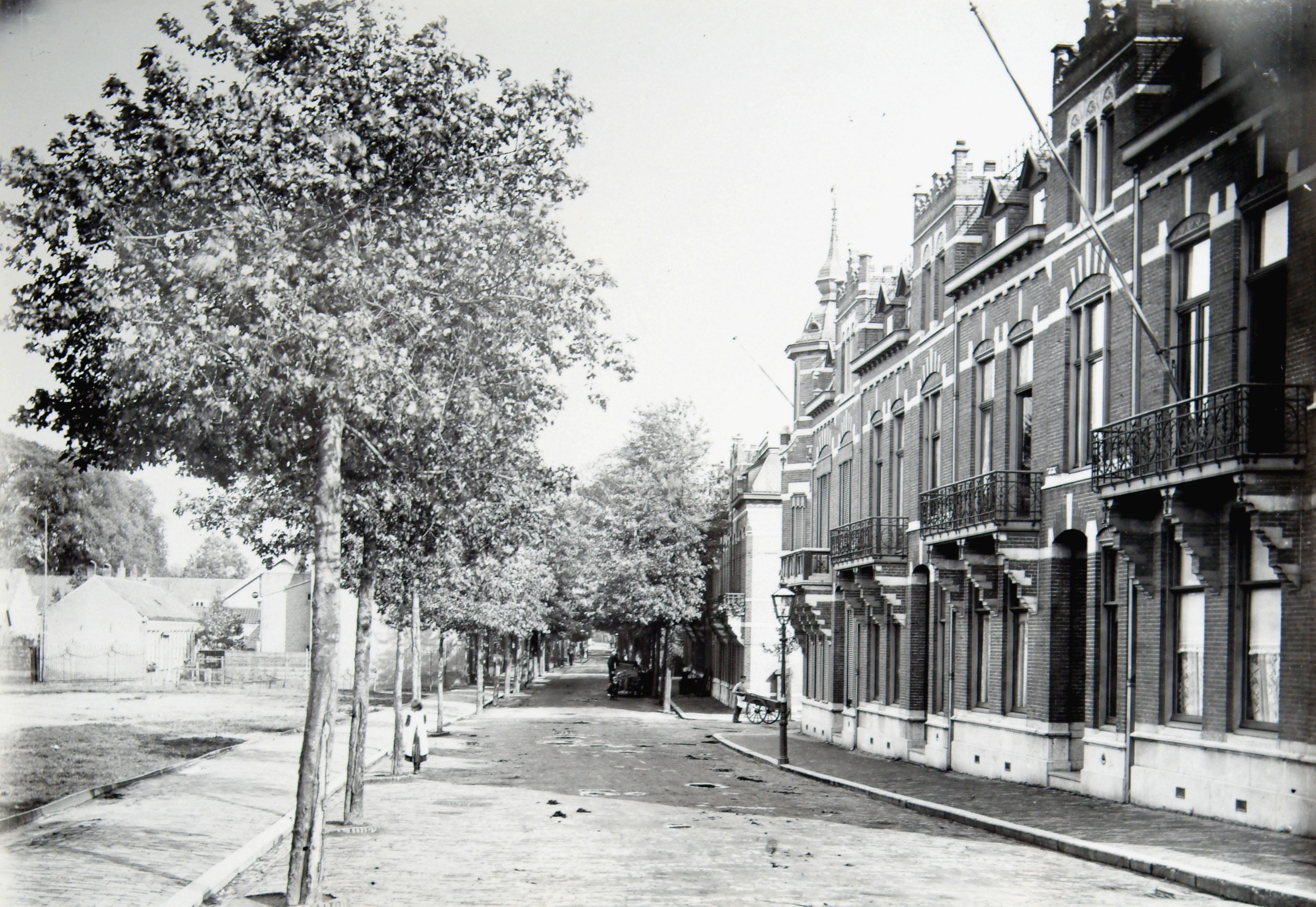 De Van Strijsingel vanaf de Hoogt. Rechts bij de handkar is de ingang naar de Rozenhof. …