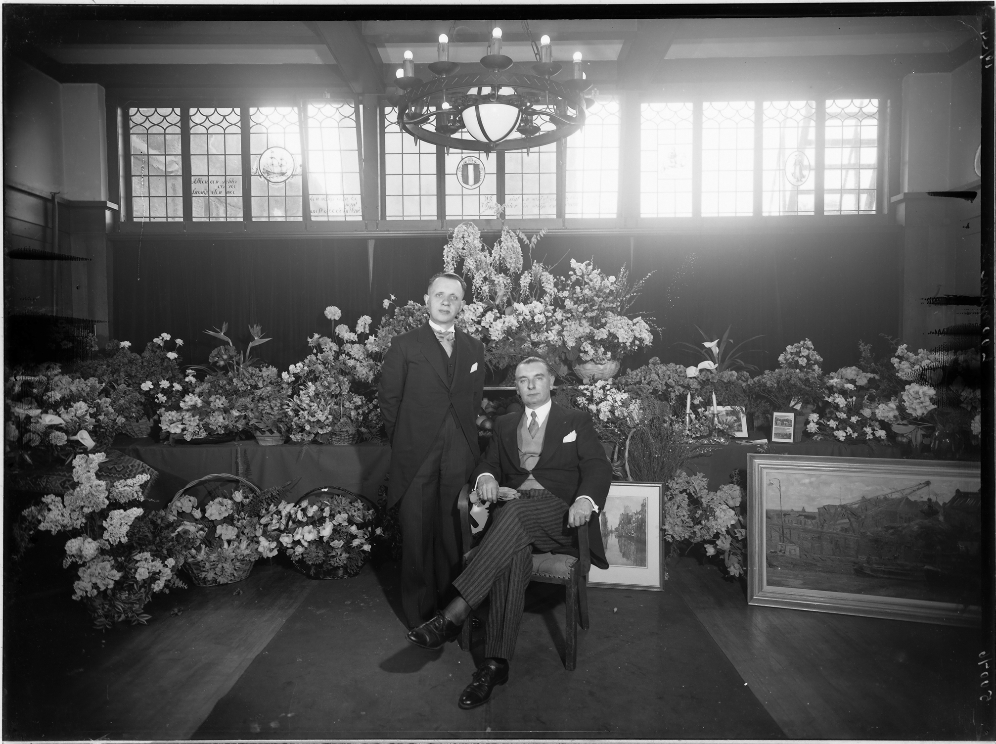 - Vader en zoon Looman bij (vermoedelijk) het afscheid van vader en overdracht aan zoon W.P.E. van het kolenhandelsbedrijf Looman aan de Noorderstraat in hun woonhuis aan de Noordendijk