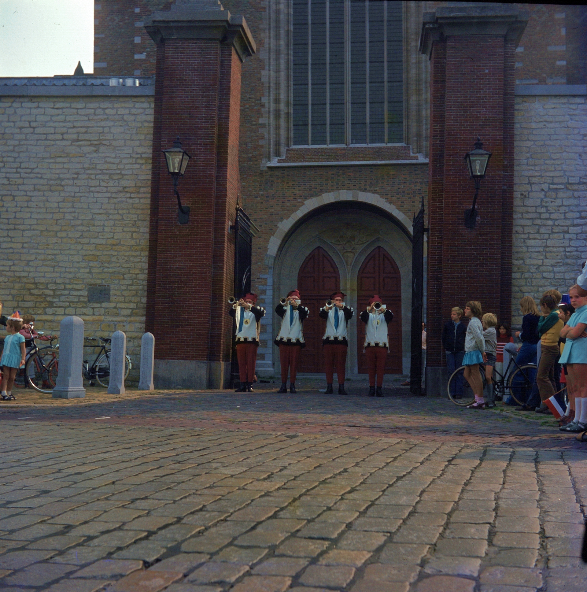 Tompetters bij de ingang van de Grote Kerk aan de Lange Gelderse Kade.