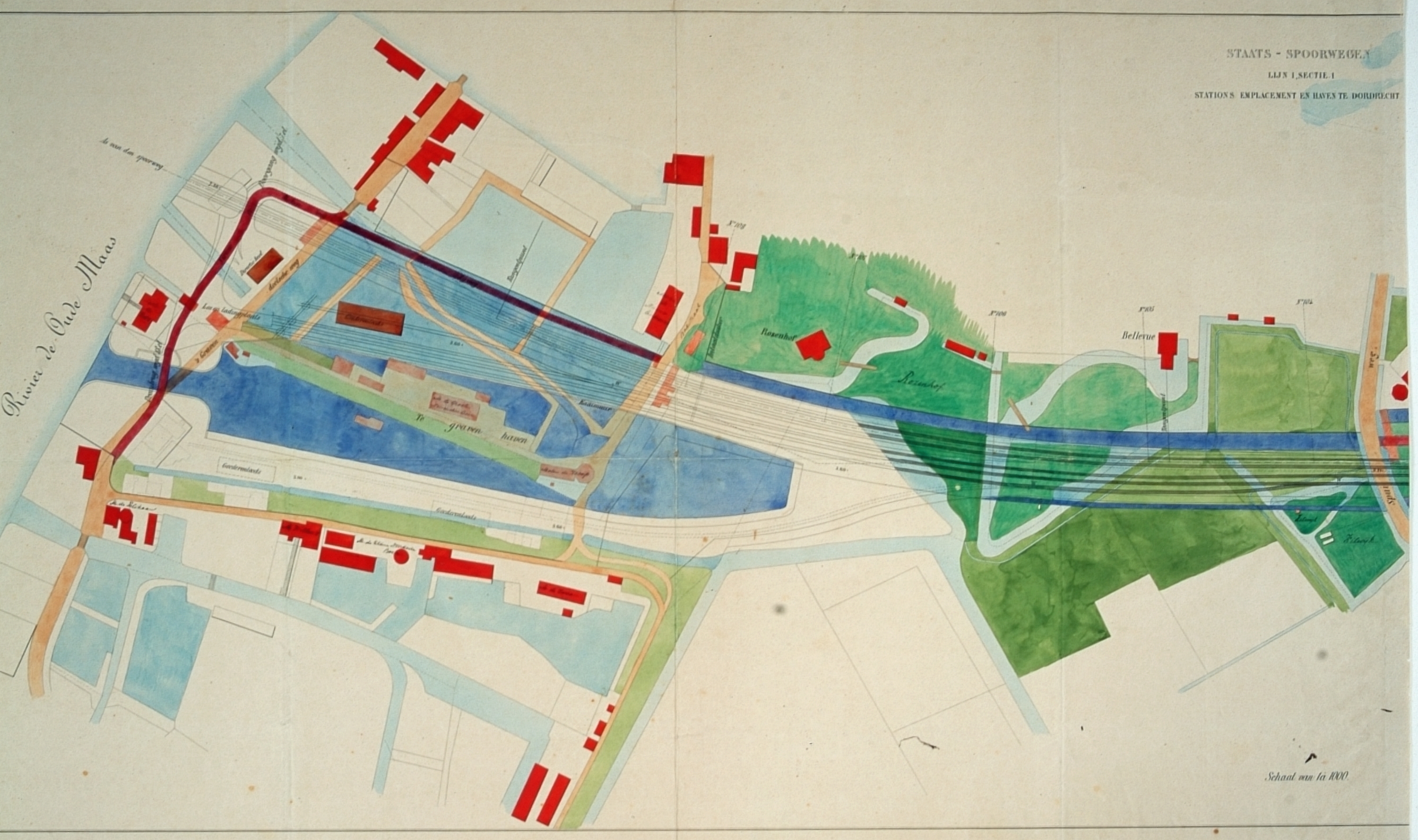 - Linker deel van een plattegrond in twee delen van het stationsemplacement en de bijbehorende Spoorweghaven, behorende bij het bestek 241, lijn 1, sectie 1, aanbesteed in 1866, van de aan te leggen Staatsspoorweg over het Eiland van Dordrecht van Willemsdorp tot aan de Oude Maas.
