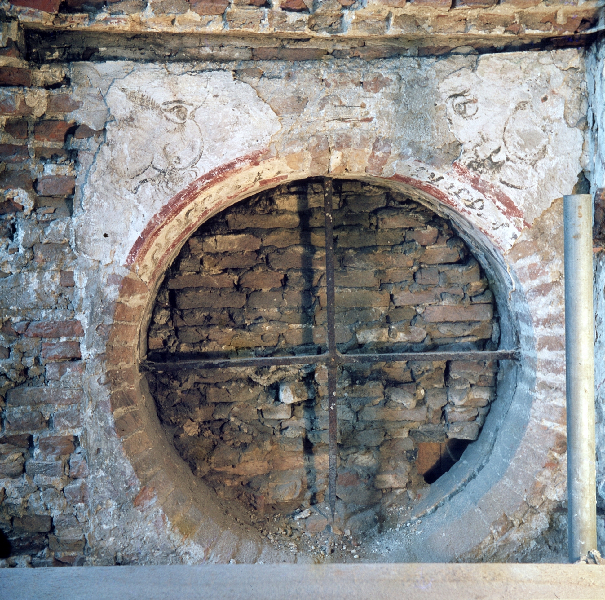 Restant van een muurschildering in de hoeken van het ronde venster, in de Statenzaal …