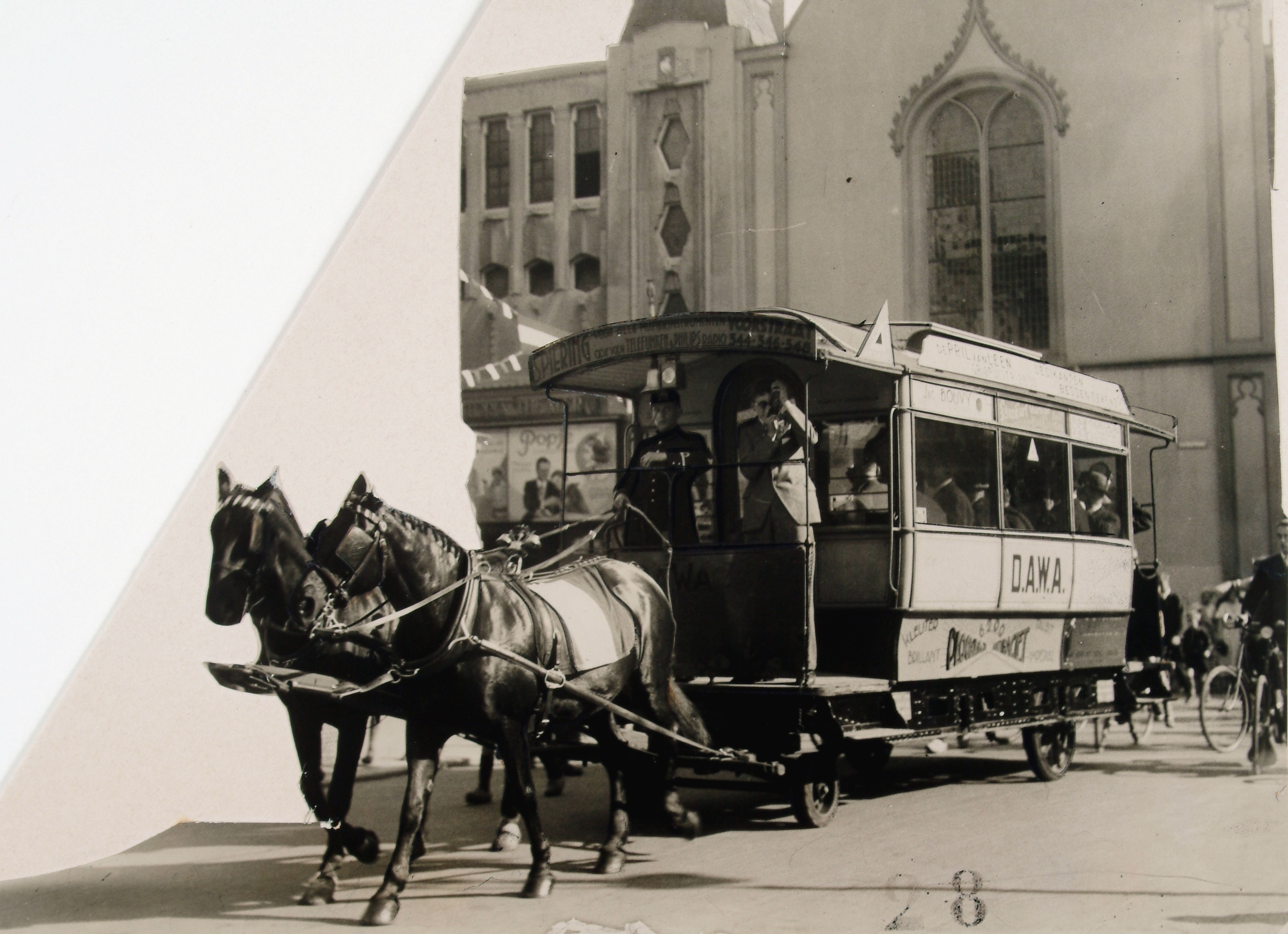 De paardentram (zonder rails) rijdt t.g.v. de D.A.W.A. over de Visbrug bij de Waalse …
