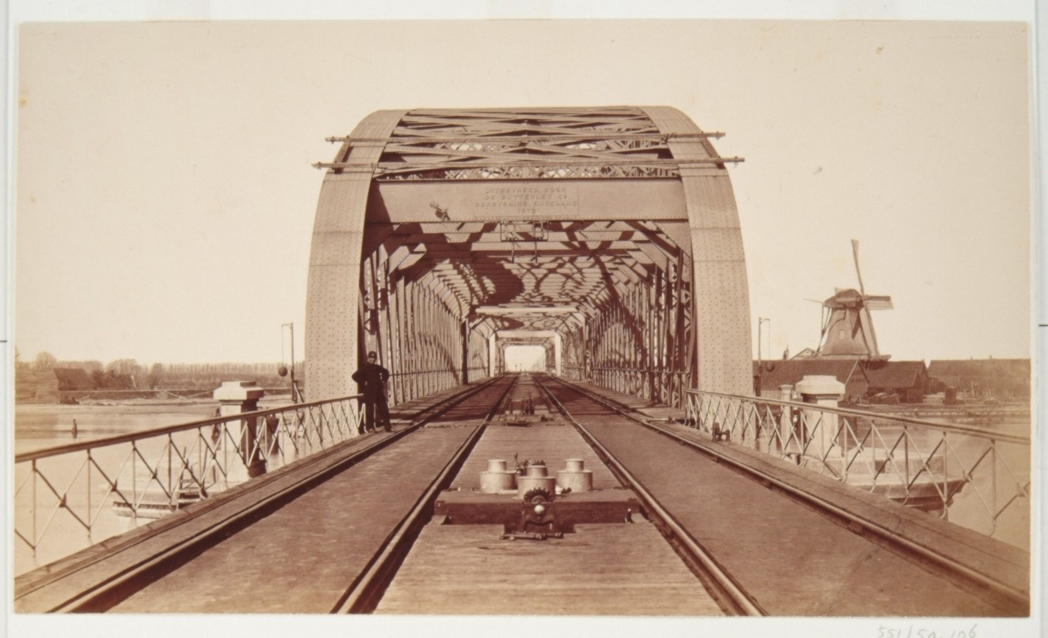 - Voltooide spoorwegbrug over de Oude Maas Rechts molen De Zeelt