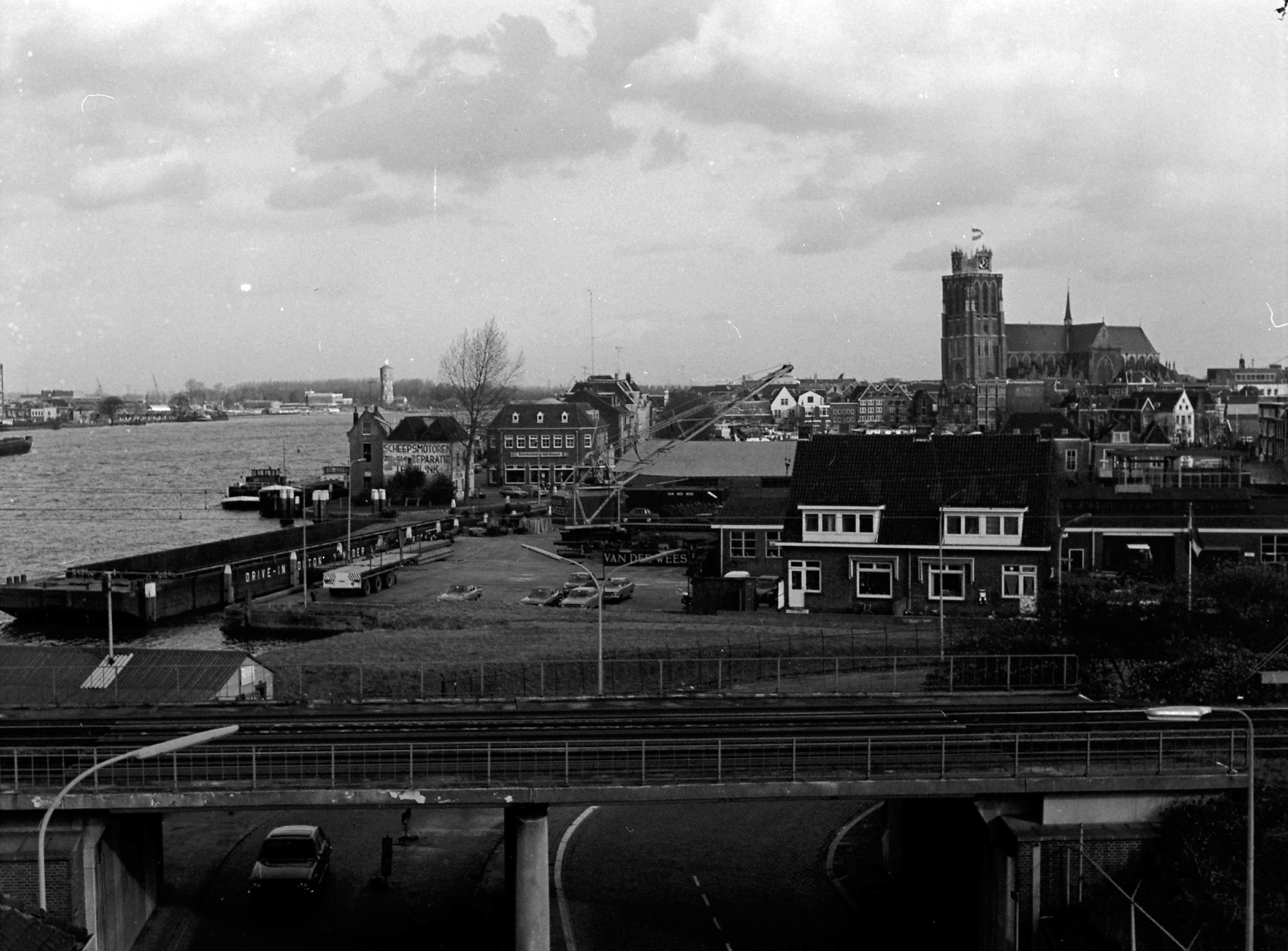 - De Dokweg met eroverheen de Spoorbrug naar Zwijndrecht en de Oude Maas. En de Grote kerk op de achtergrond