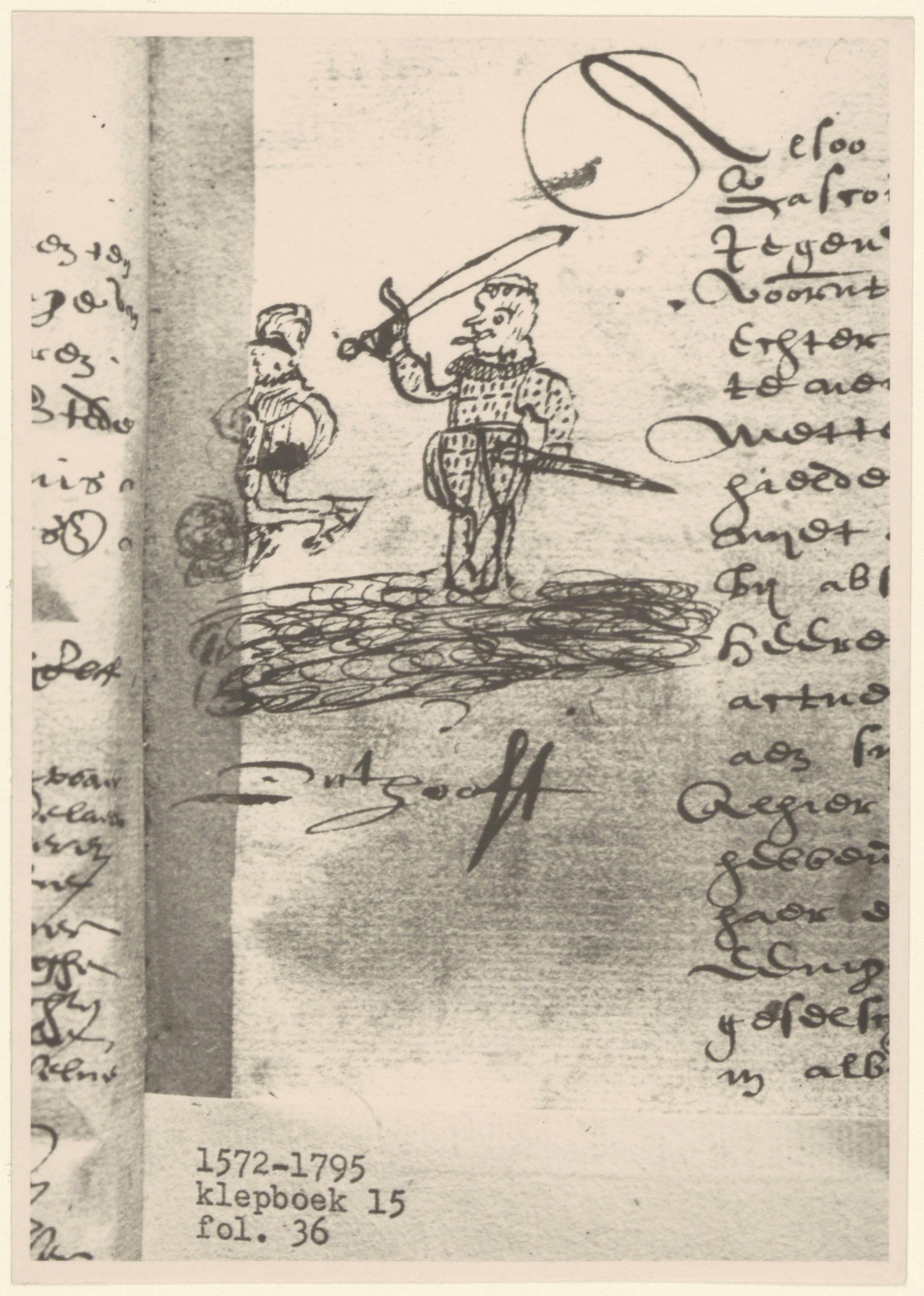 - Tekeningen in de marge van klepboeken (15,17,20 en 23) uit archief 3. Op de foto's zijn de vindplaatsen aangegeven in de klepboeken. De tekeningen zijn waarschijnlijk door anonieme klerken gemaakt in de 17e en 18e eeuw.