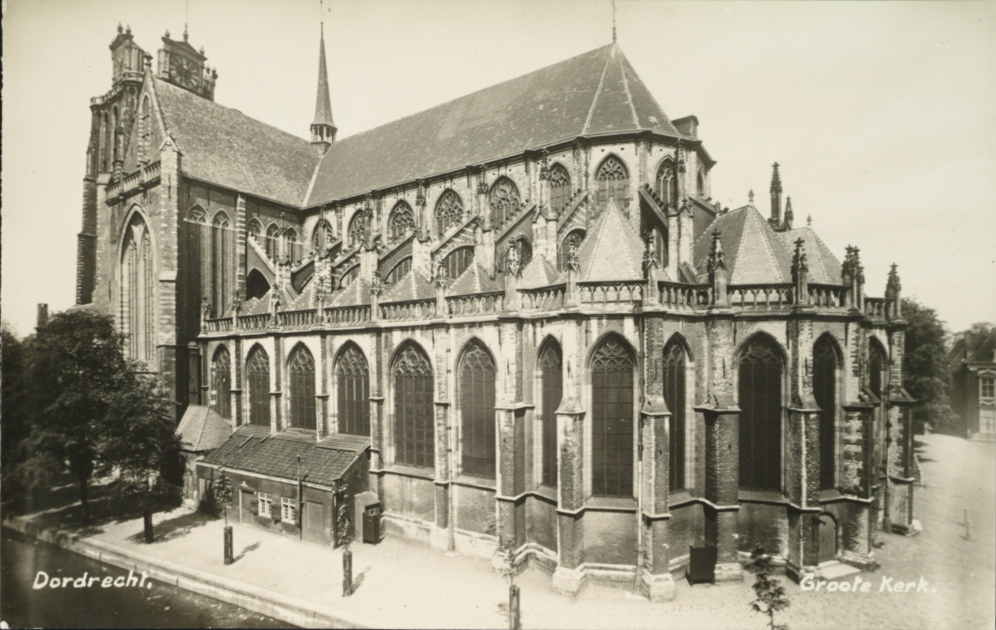 Kapellenkrans en Koor, Pottenkade en Voorstraatshaven vóór en Grotekerksplein rechts. Links naast de huisjes tegen het kerkschip staat een stovenhuis.