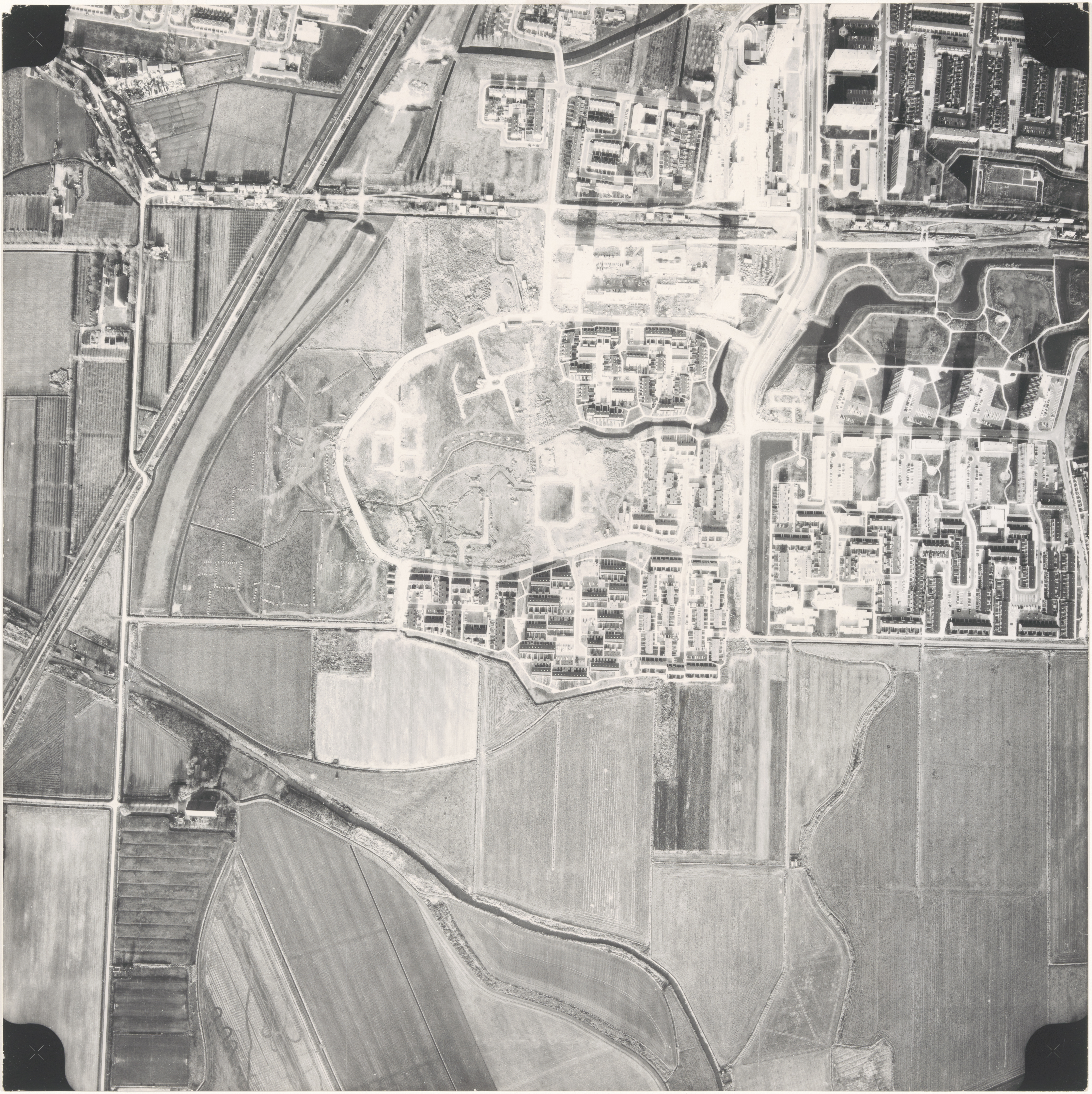 Luchtfoto van het noordwestelijk deel van Sterrenburg III. Datering (Funda): woningen aan de Indus zijn opgeleverd (1973), bouw van woningen aan de Cirkel moet nog beginnen (opgeleverd 1975). Datering opname 1973-1974.
