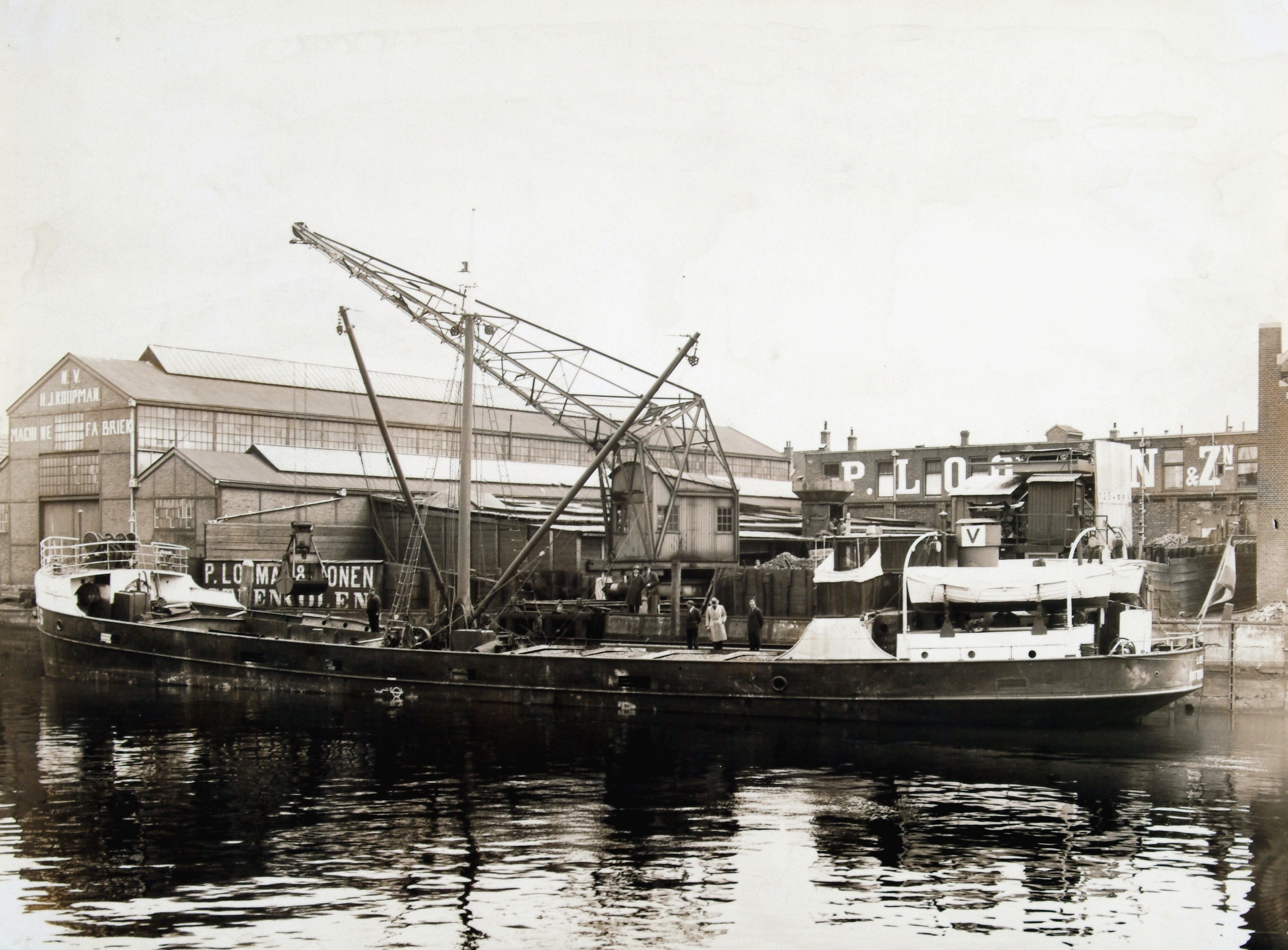 - Riedijkshaven naar Lijnbaanstraat gezien. Het lossen van het Nederlandse motorschip "Lies", dat kolen uit Engeland aanvoert voor fa. Looman. Links machinefabriek Koopman.