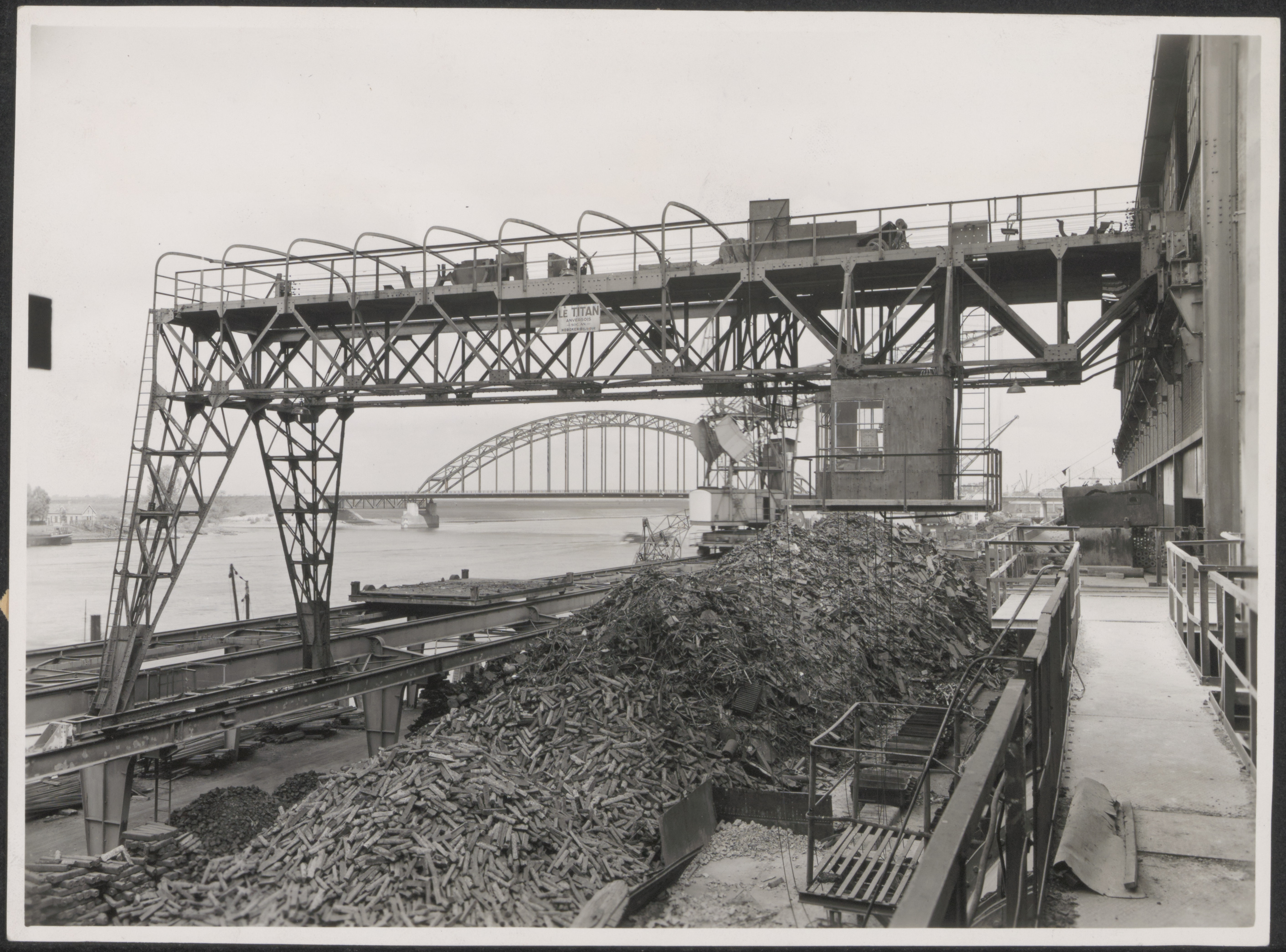 - Opslag van schrootplaats naast de smelterij van de kabelfabriek in Alblasserdam. De Brug over de Noord op de achtergrond.