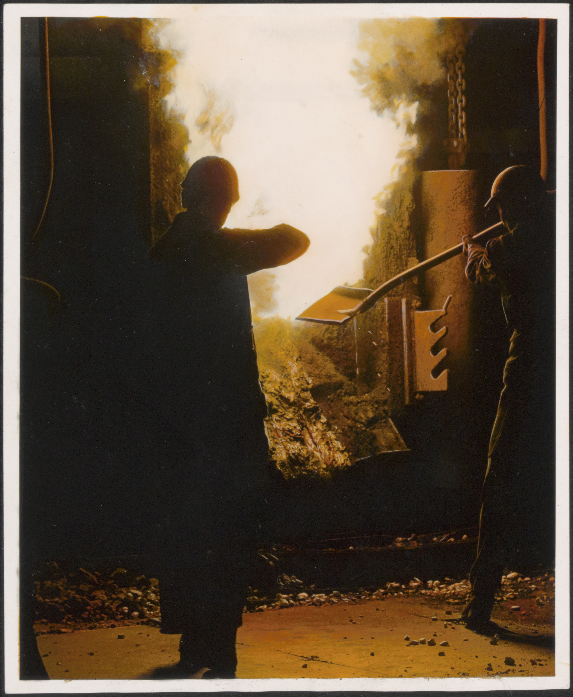 - Toevoegen van grondstoffen in de oven op de smelterij van de kabelfabriek in Alblasserdam.