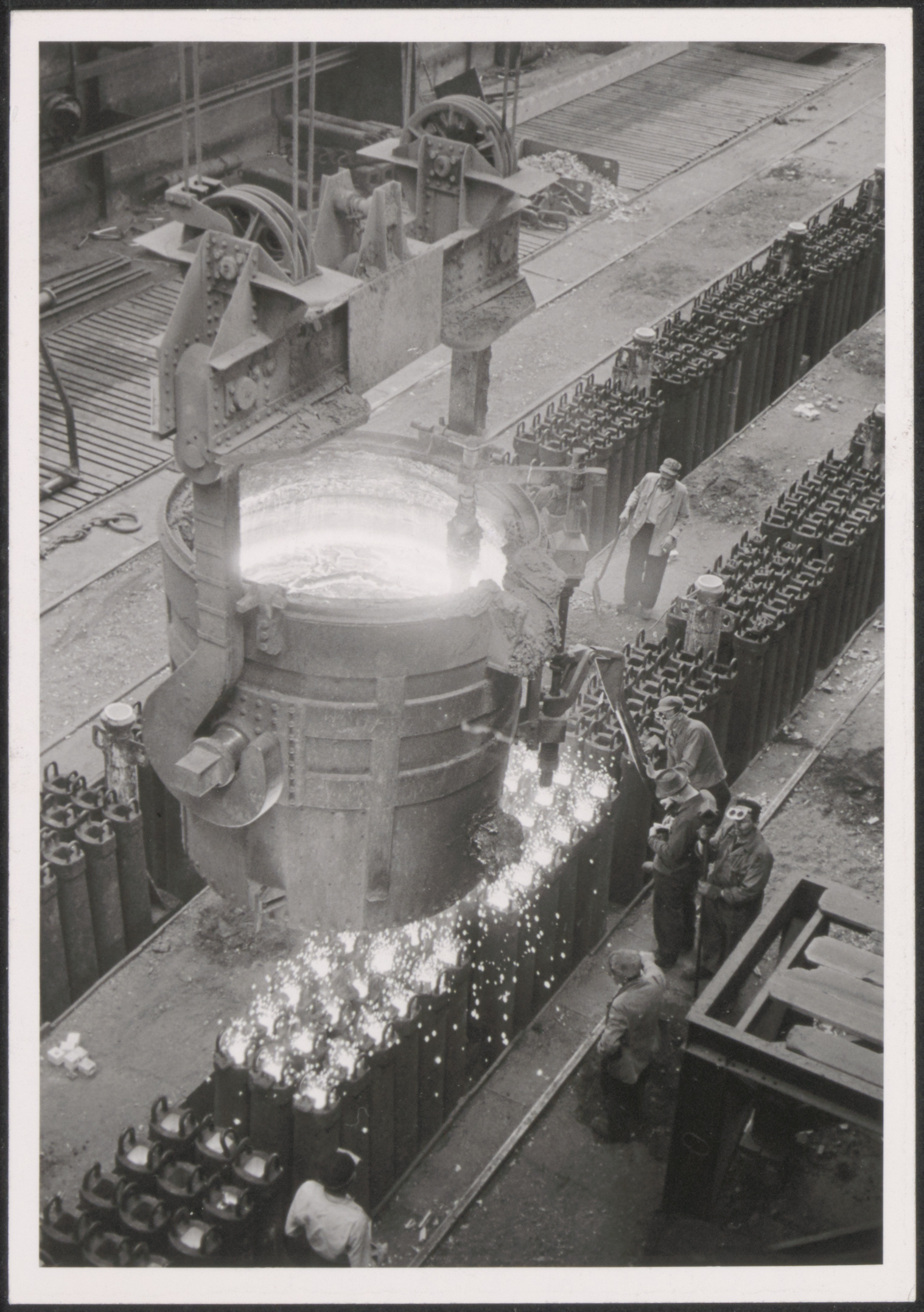 - Gieterij van de kabelfabriek in Alblasserdam. Een pan met gesmolten metaal wordt geleegd in coquilles (kleine gietstukken geschikt om gewalst of gesmeed te worden).