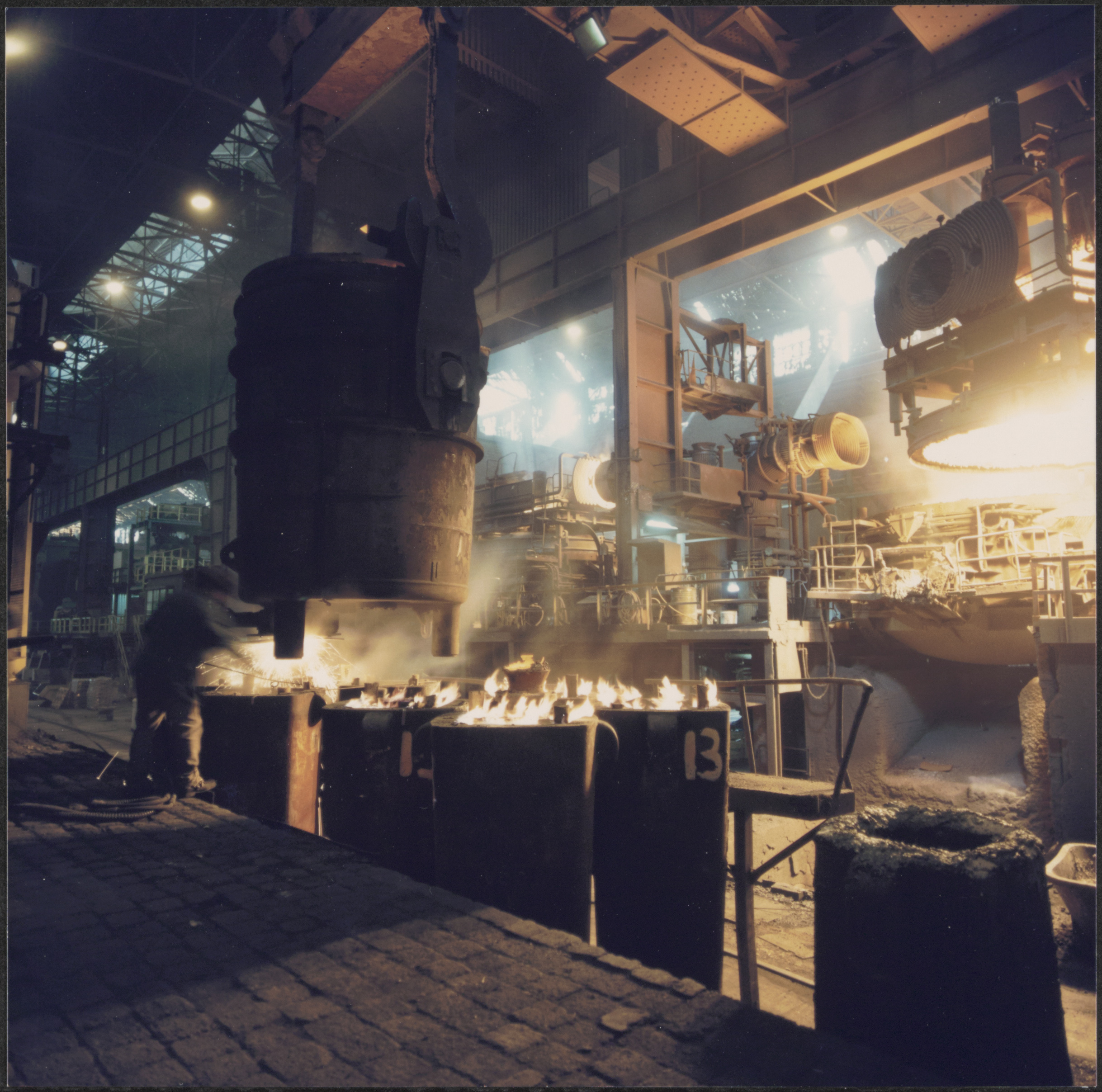 Gieten van blokken staal in de kabelfabriek in Alblasserdam.