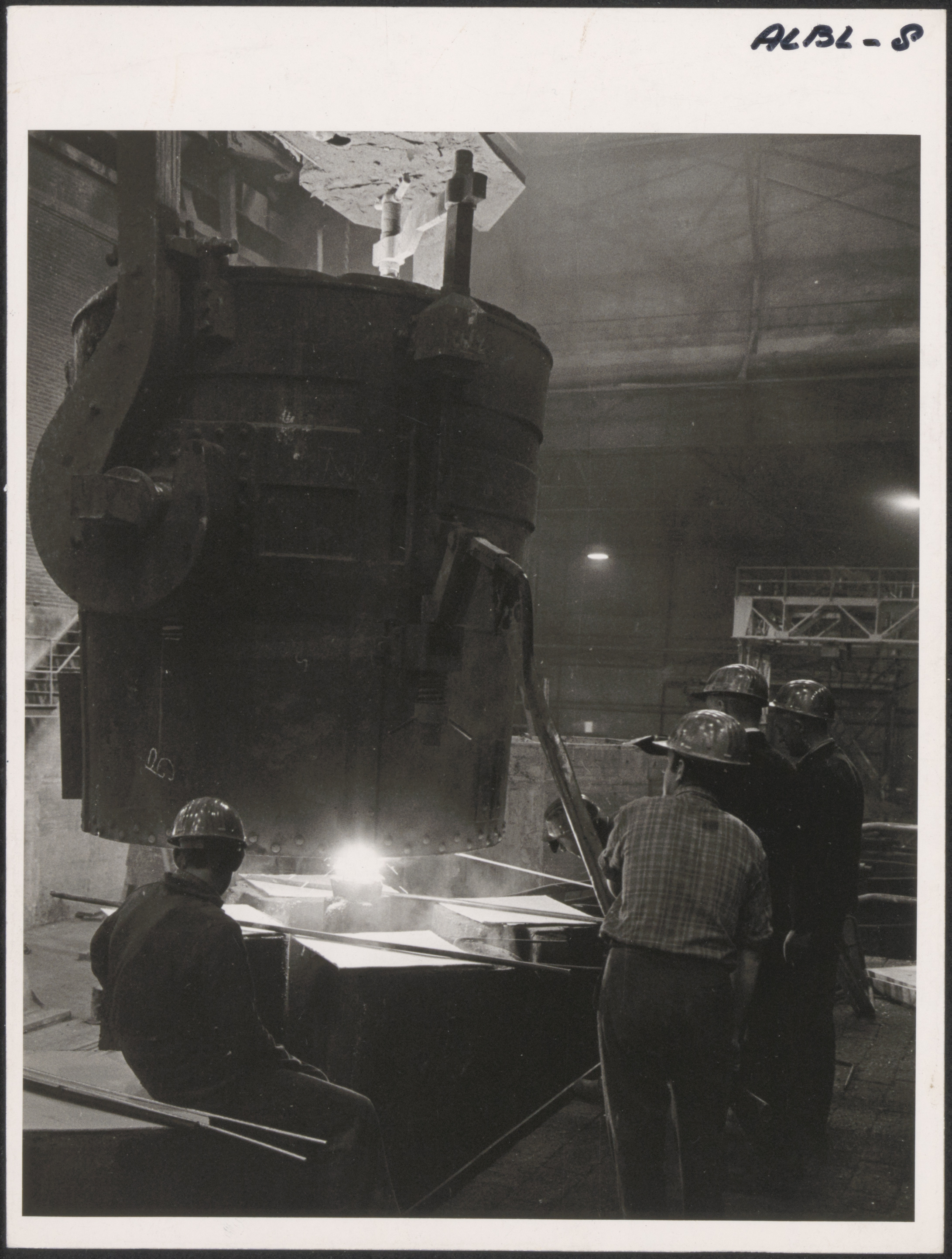 - Gieterij van de kabelfabriek in Alblasserdam. Een pan met gesmolten metaal wordt geleegd in coquilles (kleine gietstukken geschikt om gewalst of gesmeed te worden).