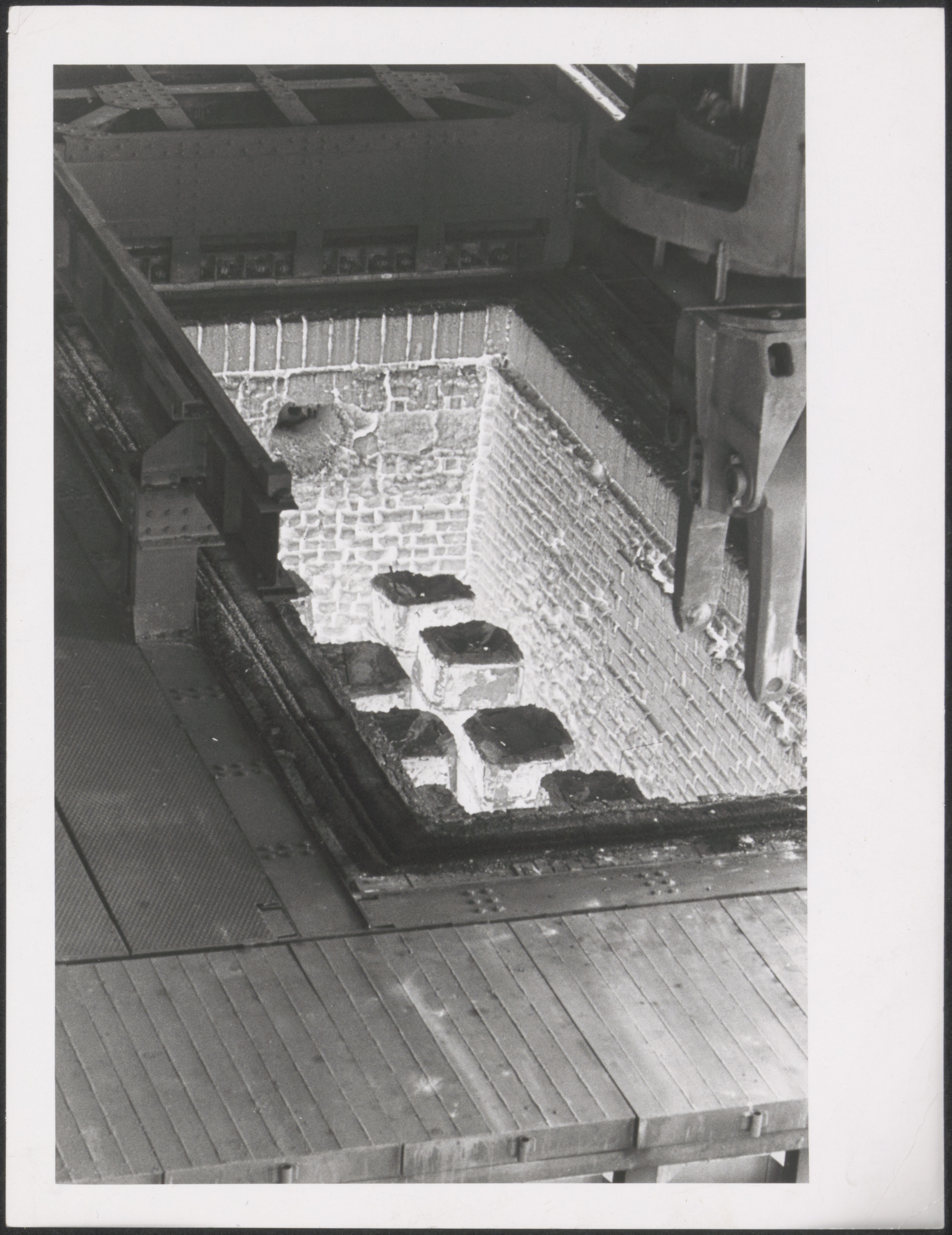 - Blokken gloeiend staal in een potoven om gewalst te worden in de kabelfabriek in Alblasserdam.