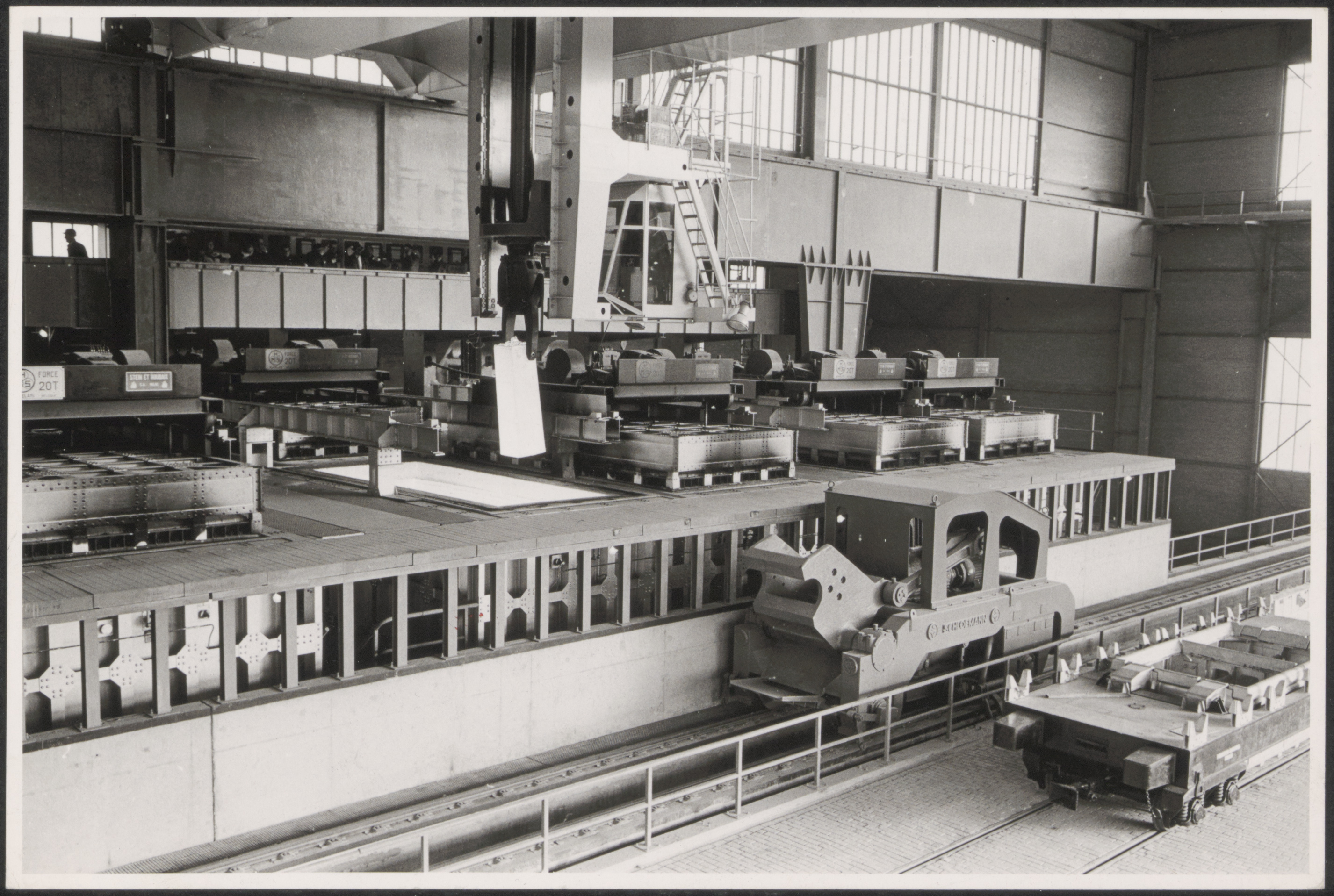 Kraan 105 trekt een voorgegloeid blok uit putoven-5. Op de voorgrond staat de automatische blokwagen klaar om het blok te ontvangen en naar de aanvoerrolbaan van de blokwals te brengen.