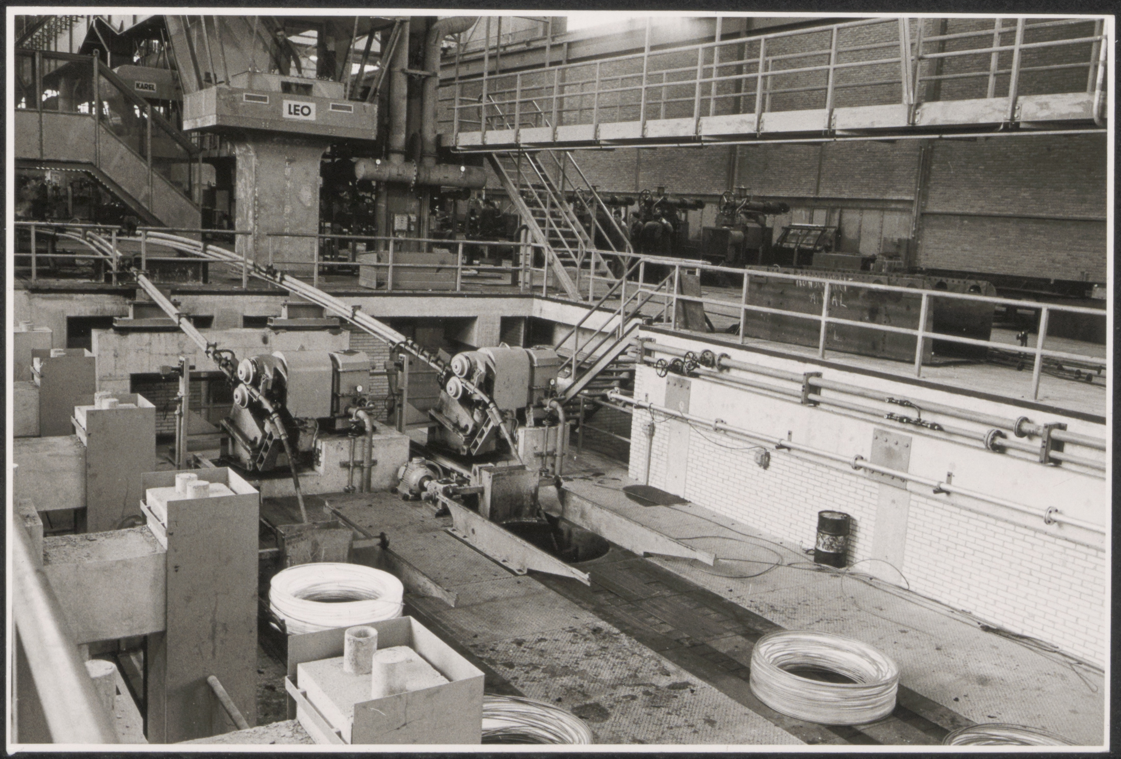 - Net gewalst gloeiend staaldraad in straat nr. 5 van de draadwalserij in de kabelfabriek in Alblasserdam.