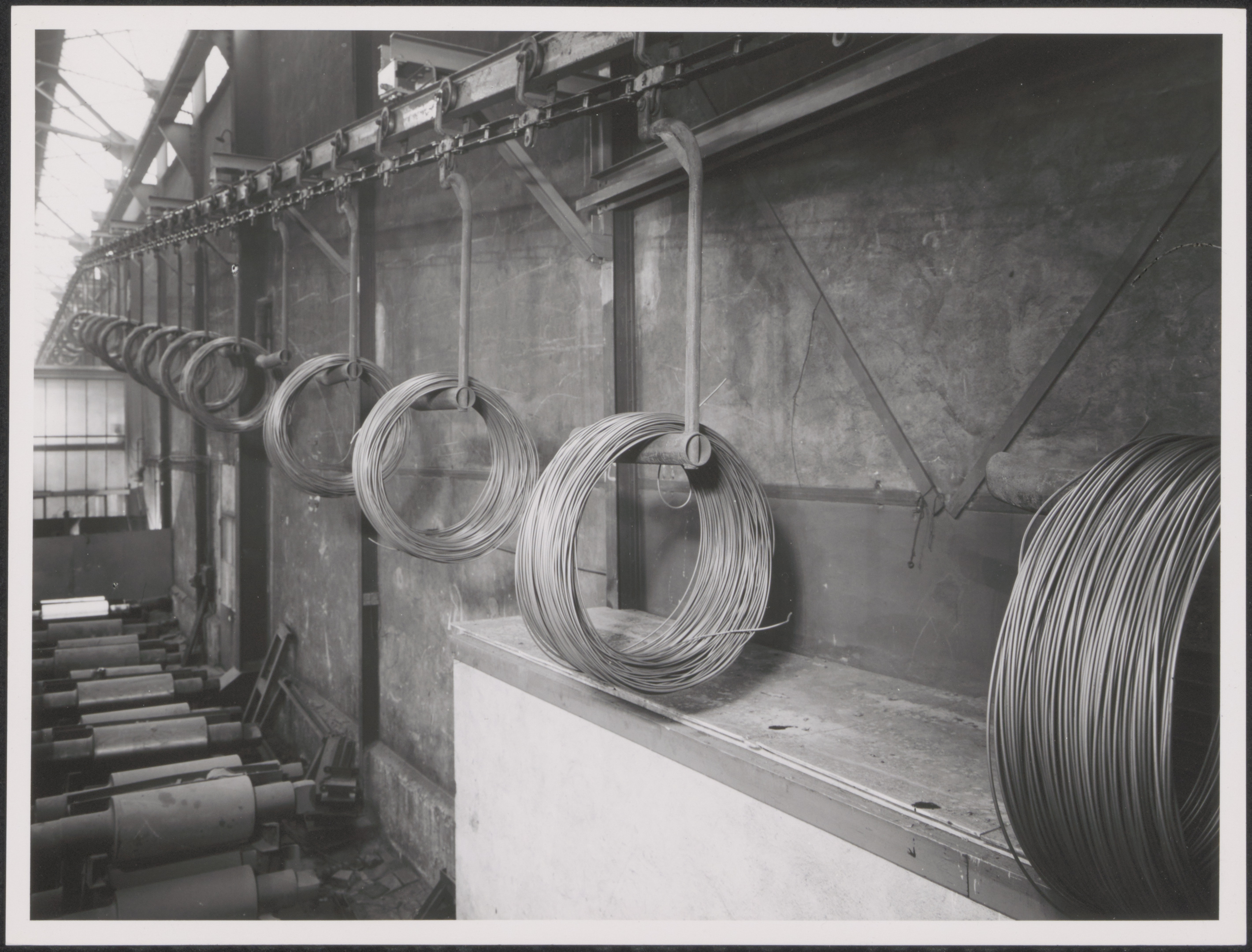 De zgn. hakenbaan voor het vervoer bossen metaaldraad in de kabelfabriek in Alblasserdam.