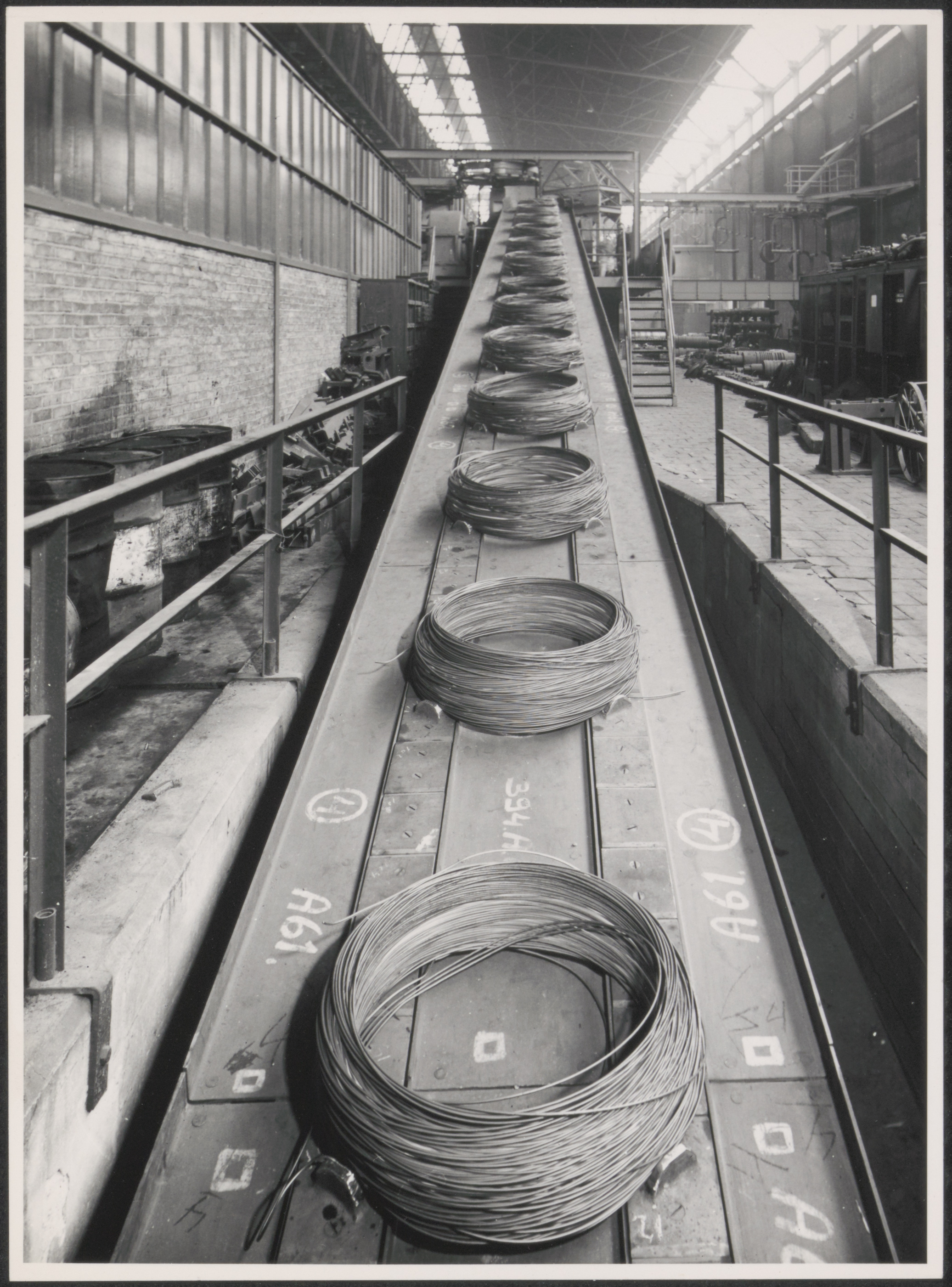 - Vervoer van opgerold staaldraad in de zgn. draadstraat nr. 2 van de kabelfabriek in Alblasserdam.