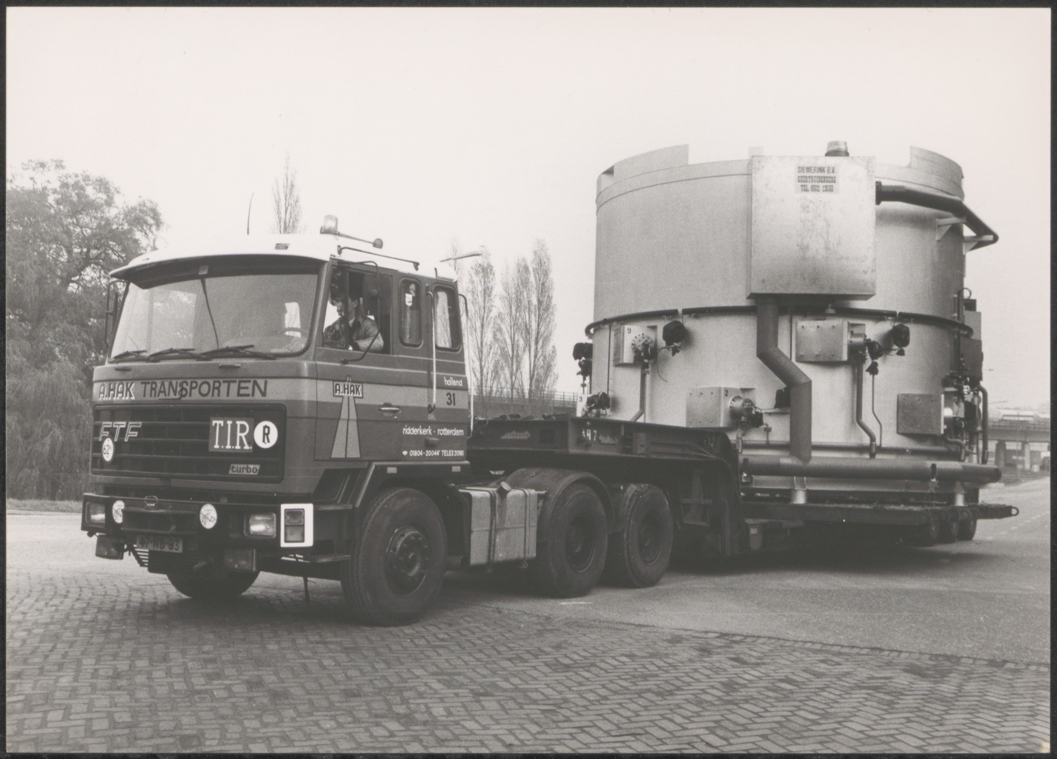 Op 1 november 1985 transporteerde de firma A. Hak uit Ridderkerk deze gloeioven naar de staaldraadfabriek Nedstaal in Alblasserdam. De oven kwam uit Oostenrijk, maar werd bij Siemerink Tank- en Apparatenbouw in Geertruidenberg geassembleerd. Een schip bracht de oven van Geertruidenberg naar Alblasserdam. De laatste 2 kilometer werd per as afgelegd. Het transport over de weg liep vertraging op, omdat in de buurt van de in aanbouw zijnde Noordtunnel, een wegdeel onverwacht was opgebroken. Met man en macht werd het straatwerk teruggelegd om het transport veilig te laten passeren. Op de achtergrond zijn meerdere betonnen viaduct overspanningen van de oude Rijksweg 15, nu N915, te zien. Het speciale en zware voertuig is gebouwd door FTF. (Floor’s Truck Trailer Fabriek) Deze Hollandse firma bouwde tussen 1966 en 1995 in totaal 668 zware trucks. De cabine is gemaakt bij Motorpanels in Engeland. Voor de aandrijving zorgde een Amerikaanse Detroit tweetakt dieselmotor en daarvan was de Dordtse firma Roodenburg in de Merwedestraat dealer. De brede en 11,5 ton wegende gloeioven ligt op een Nooteboom dieplader. Zowel de FTF trekker als de Nooteboom trailer zijn in het Gelderse Wijchen gebouwd.