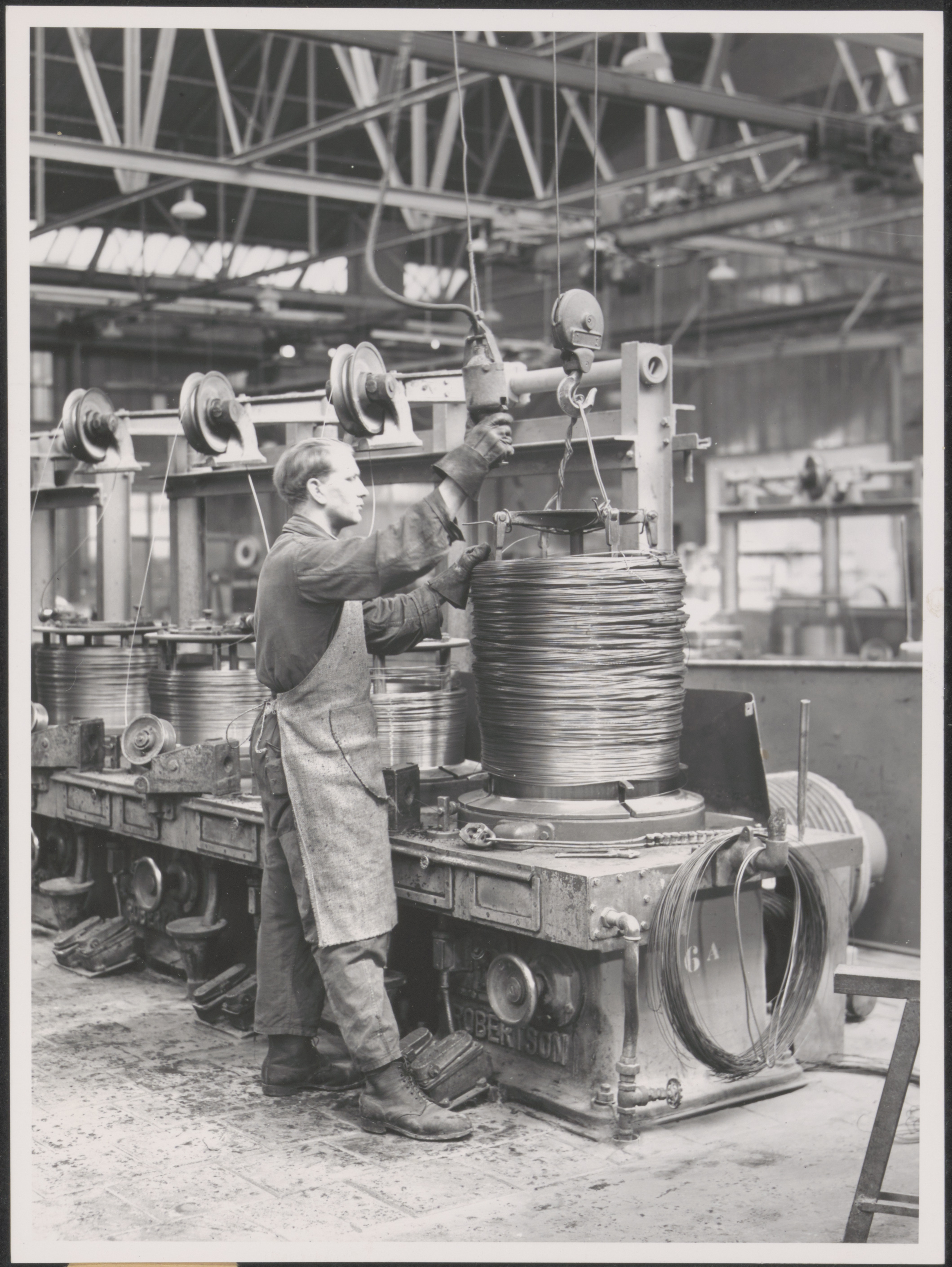 Afdeling waar staaldraad wordt getrokken in de kabelfabriek in Alblasserdam.