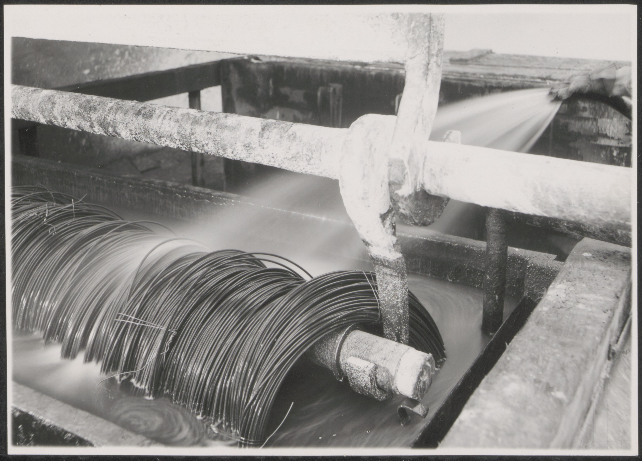 - Reinigen van gewalst staaldraad door onderdompeling in een zuurbad (beitsen) in de kabelfabriek in Alblasserdam.