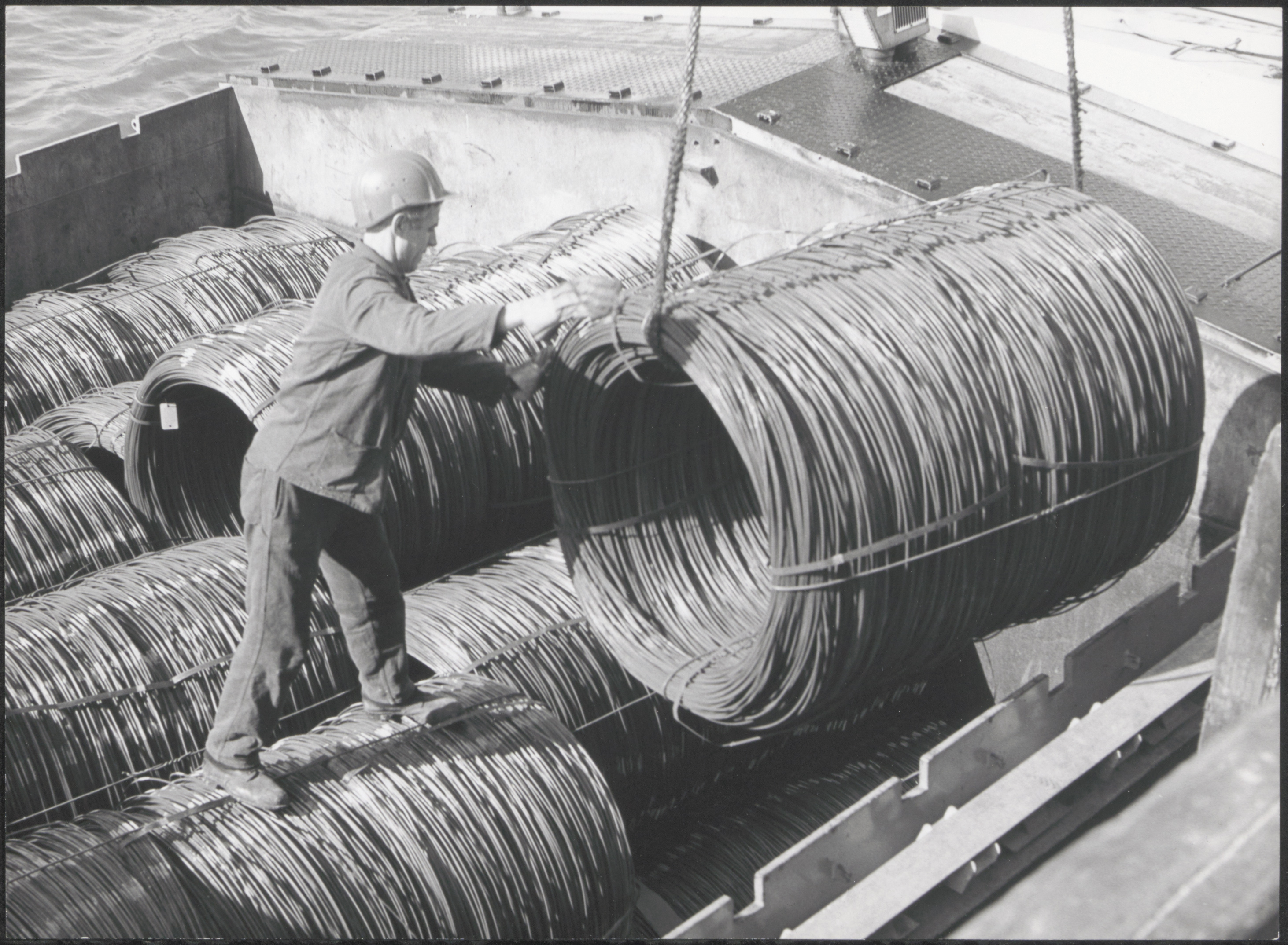 - Laden van staaldraad in een vrachtboot in de Noord bij de kabelfabriek in Alblasserdam.