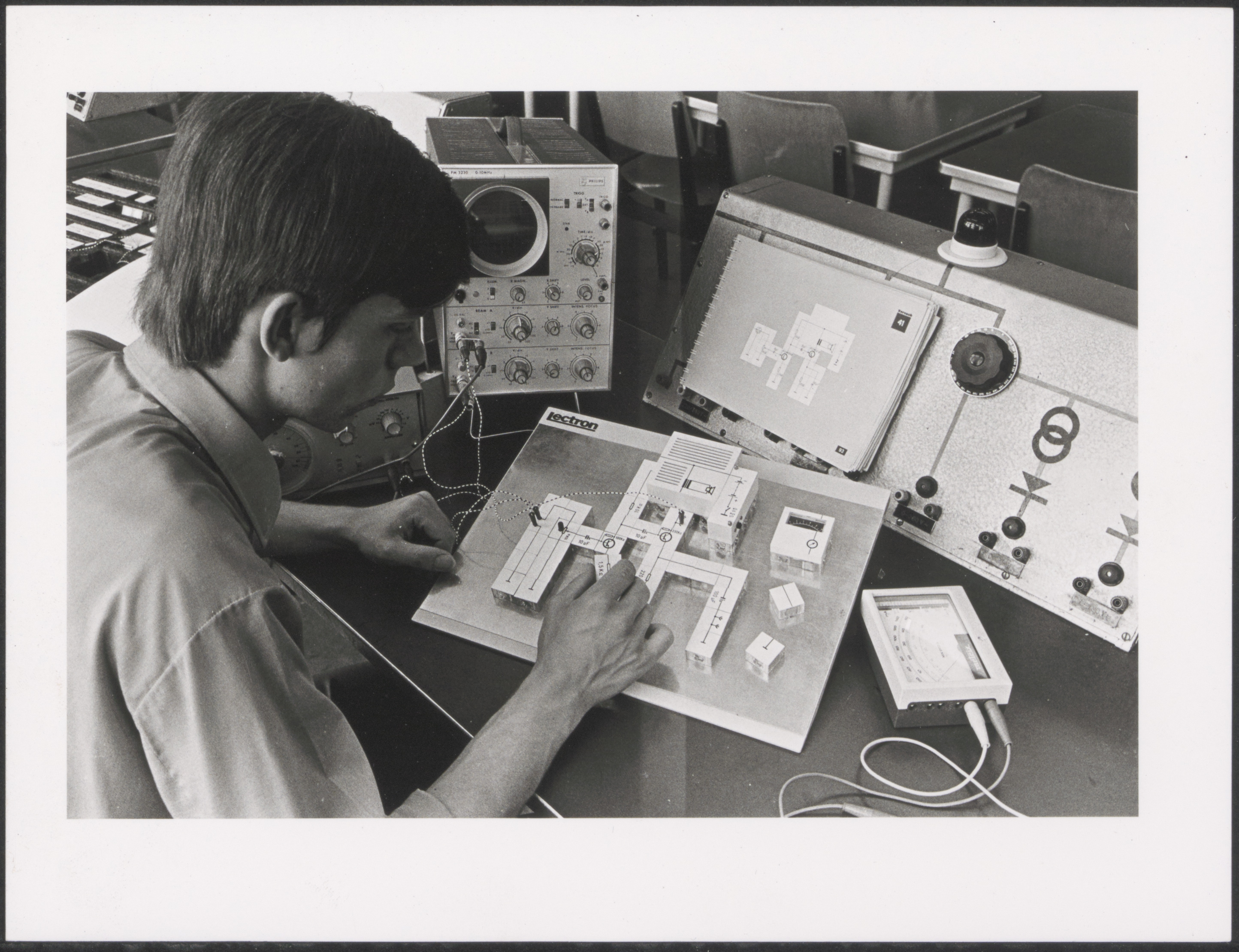 - Opleidingsruimte voor elektronici in de bedrijfsschool van de kabelfabriek in Alblasserdam.