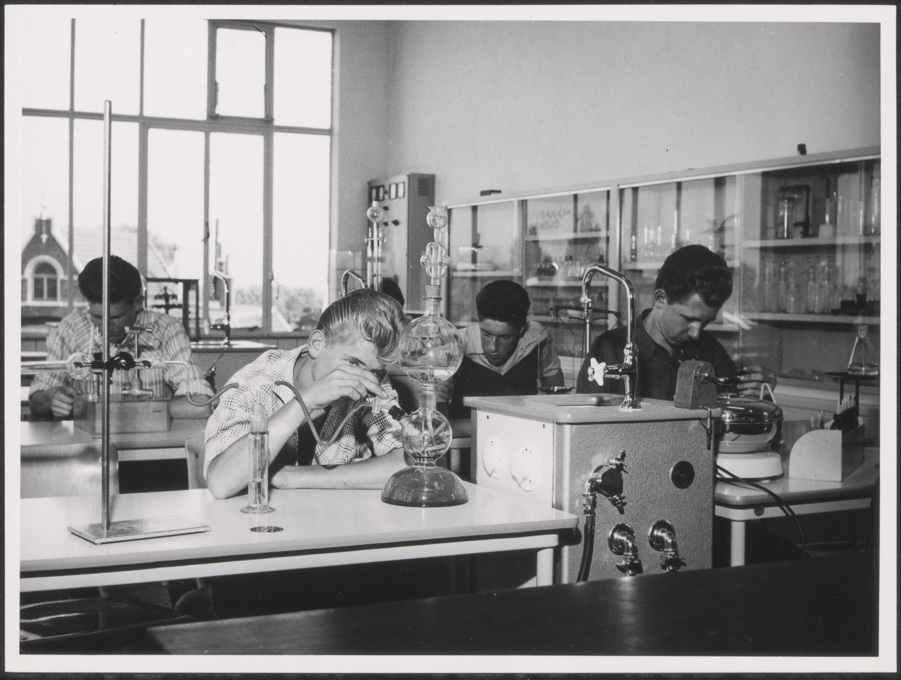 Leerlingen in het laboratorium van de kabelfabriek in Alblasserdam.