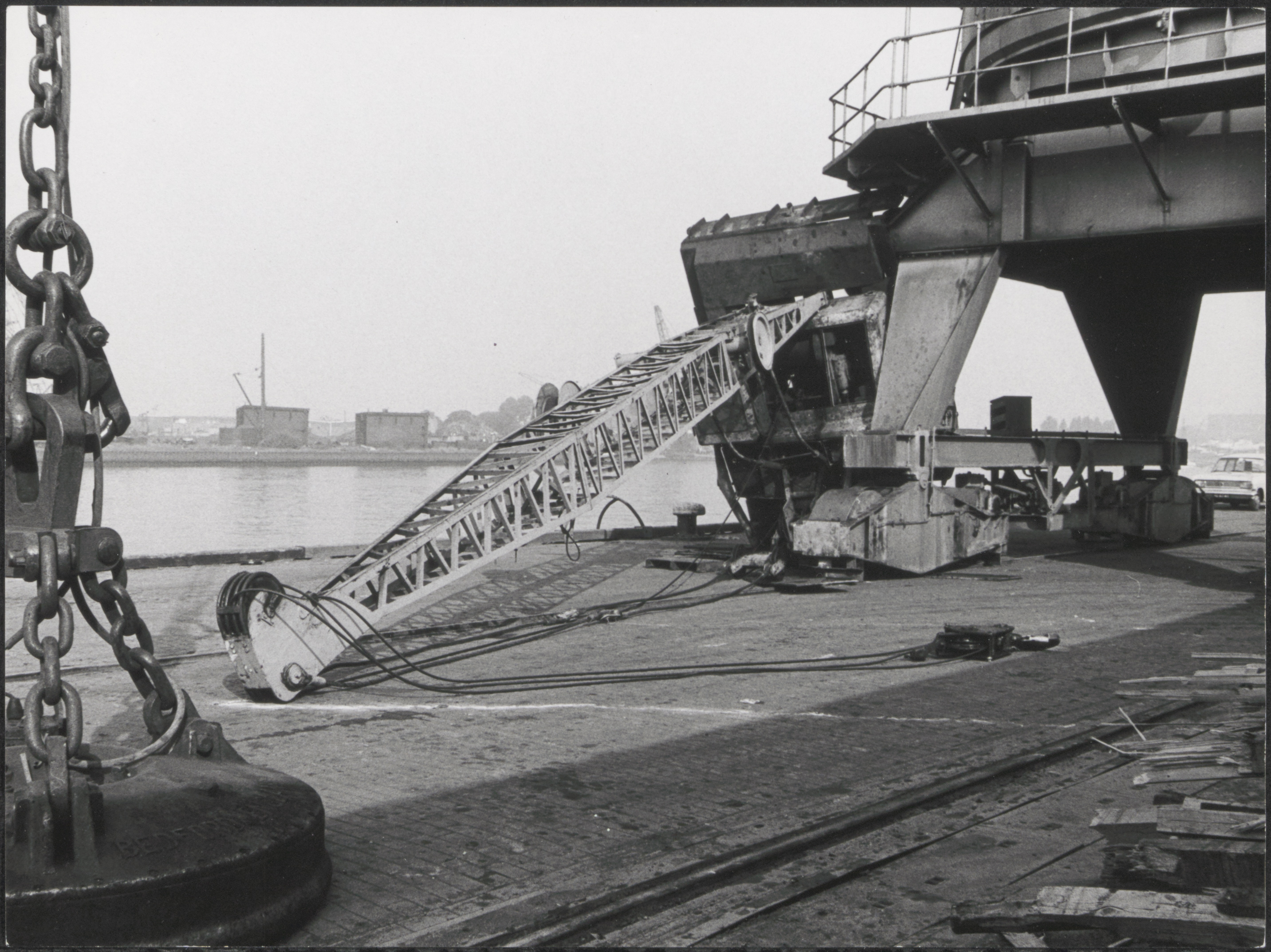 - Een aangereden mobiele hijskraan door een kraan op rails op de loskade van de kabelfabriek in Alblasserdam. Links een sterke elektromagneet om schroot te lossen uit vrachtschepen op de Noord.