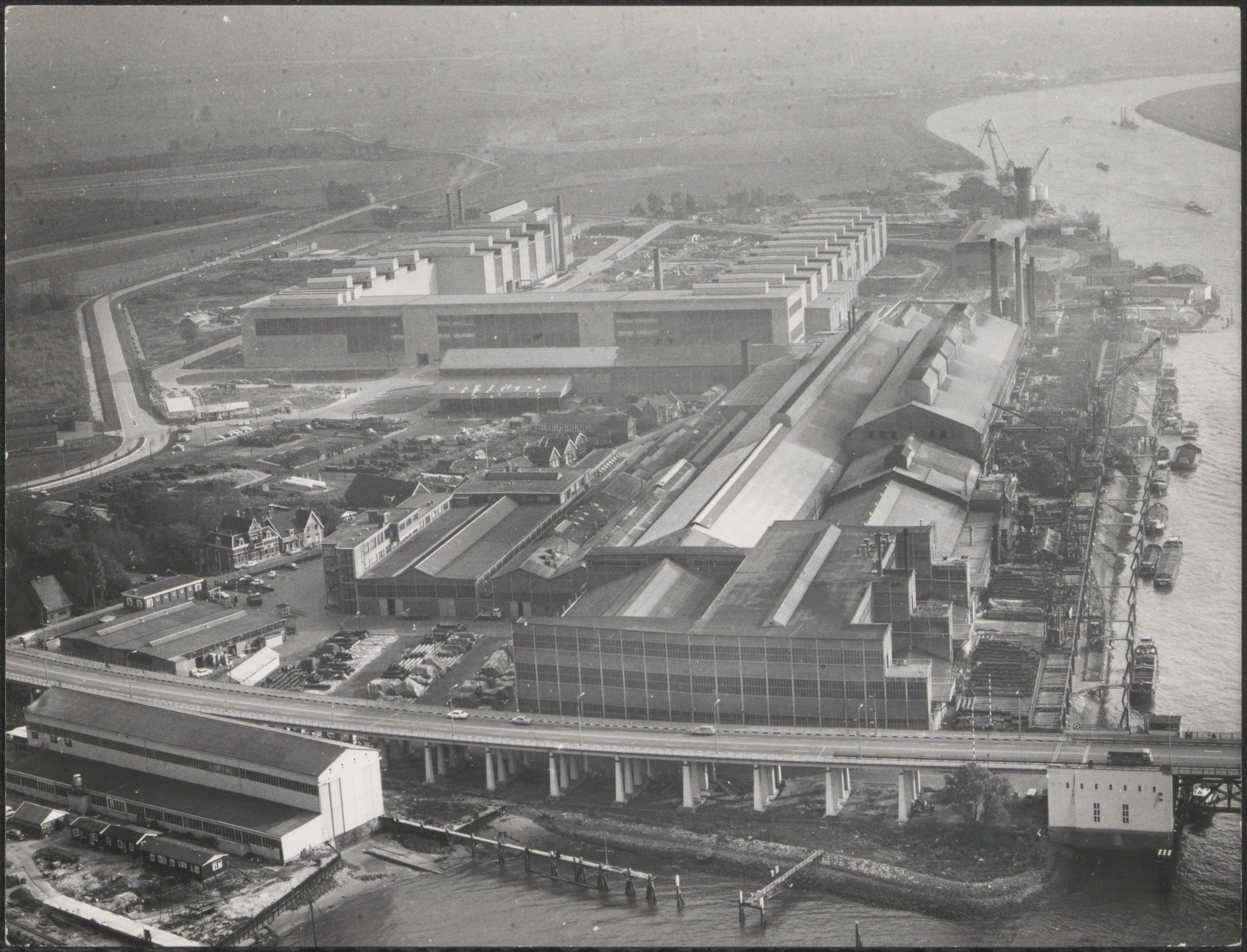 - Luchtfoto van de kabelfabriek in Alblasserdam. Op de voorgrond de oprit van de Brug over de Noord en de marineloods van scheepswerf De Noord.