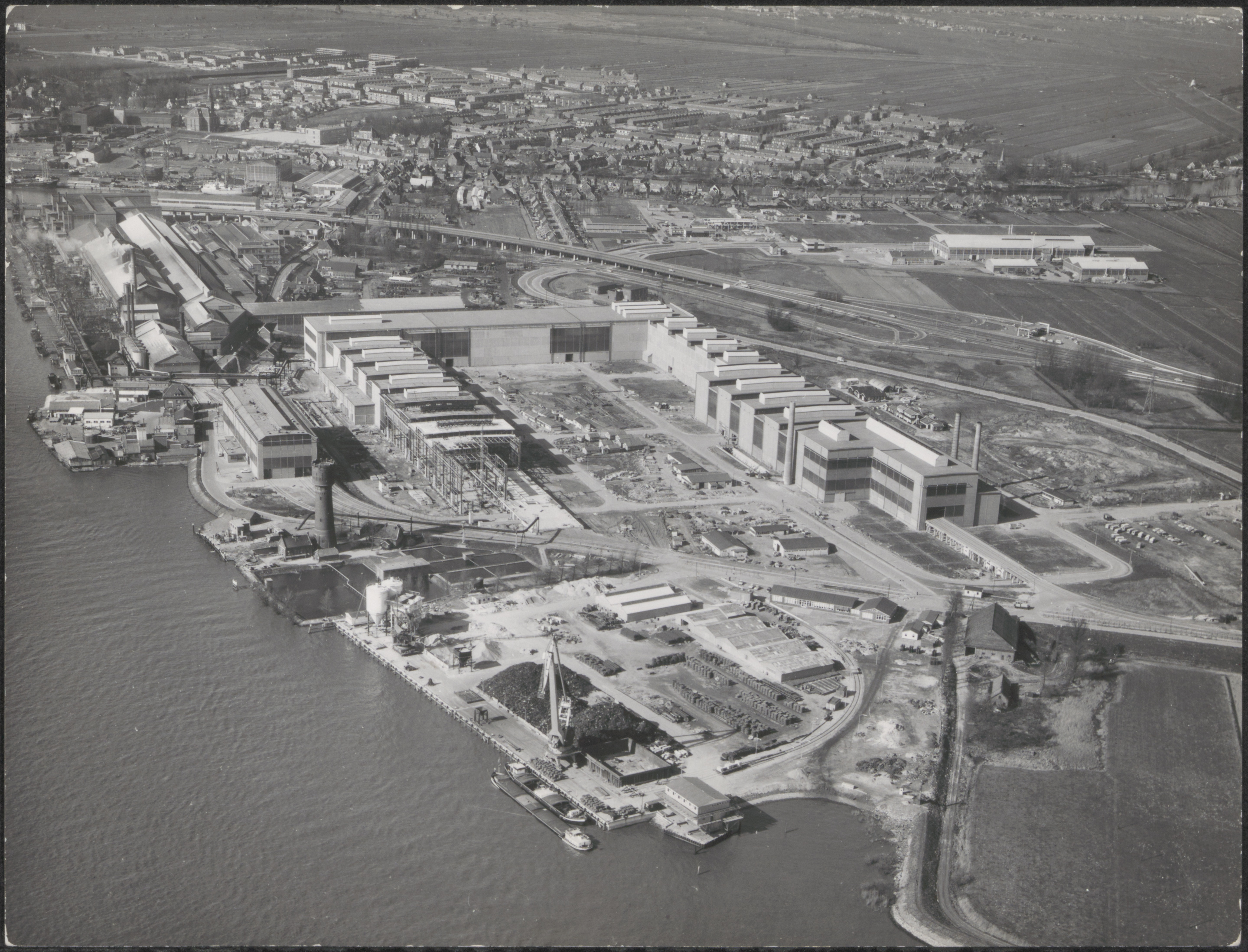 - Luchtfoto van de bouw van de zgn. blokstraat op het terrein van de kabelfabriek in Alblasserdam. Linksmidden de watertoren en middenonder zuurstoffabriek De Alblas.