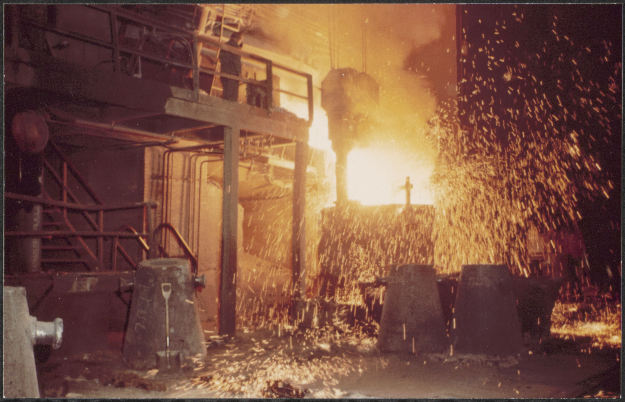 Legen van een vat gesmolten staal in de gieterij van de kabelfabriek in Alblasserdam …