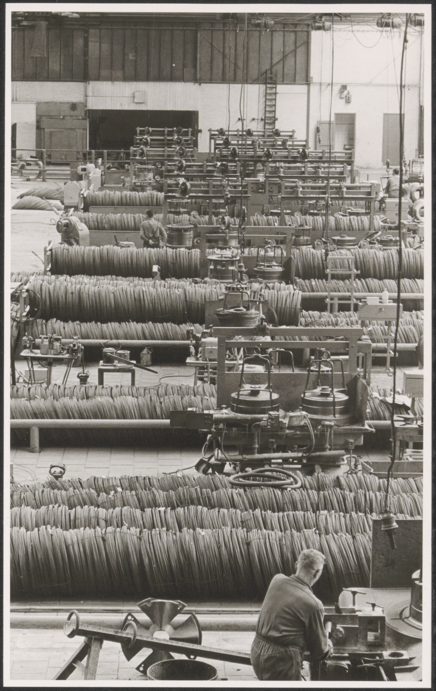 Afdeling voor het trekken van staaldraad in de kabelfabriek in Alblasserdam.
