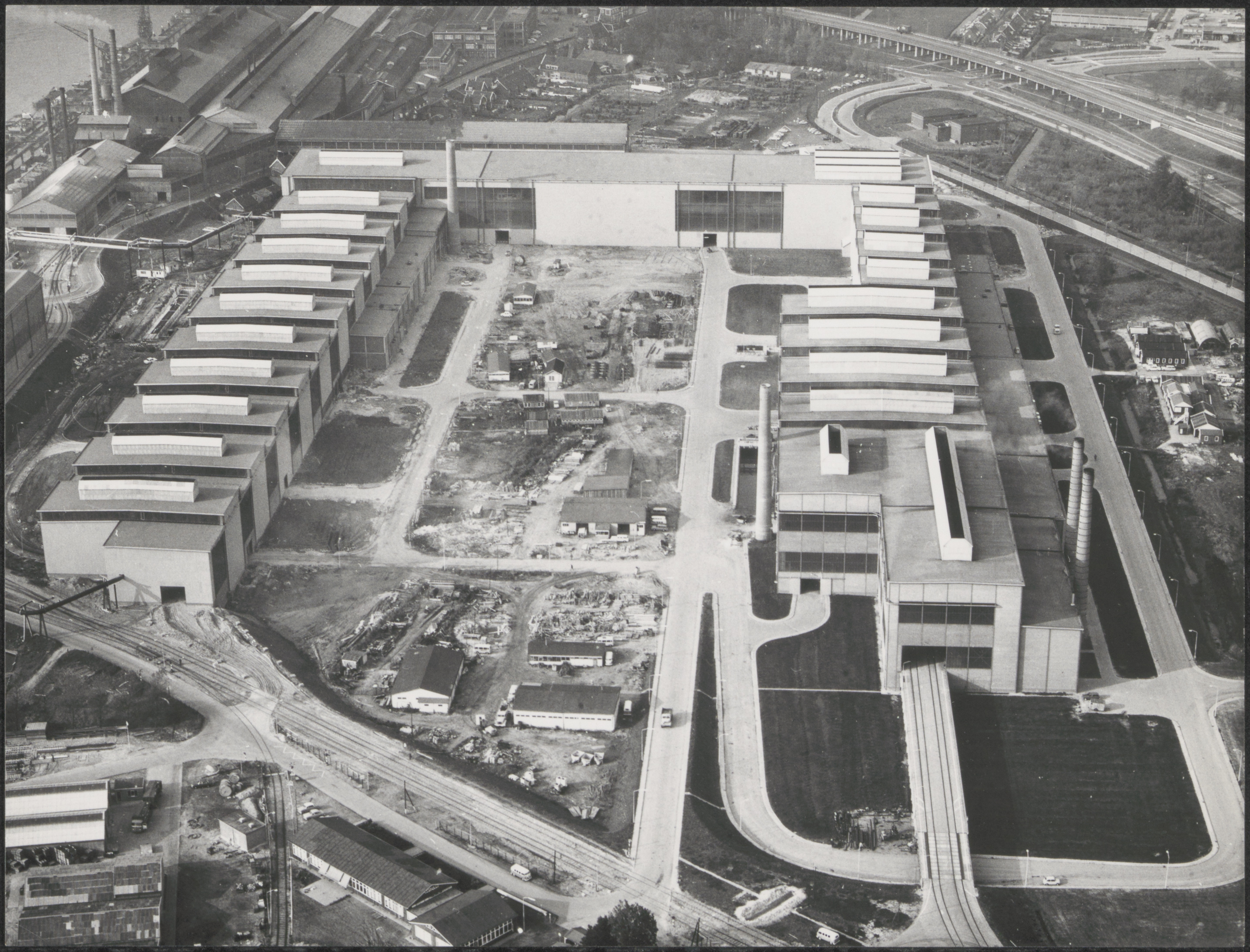 Luchtfoto nieuwbouw blokstraat en magazijnen - centrale werkplaats etc.