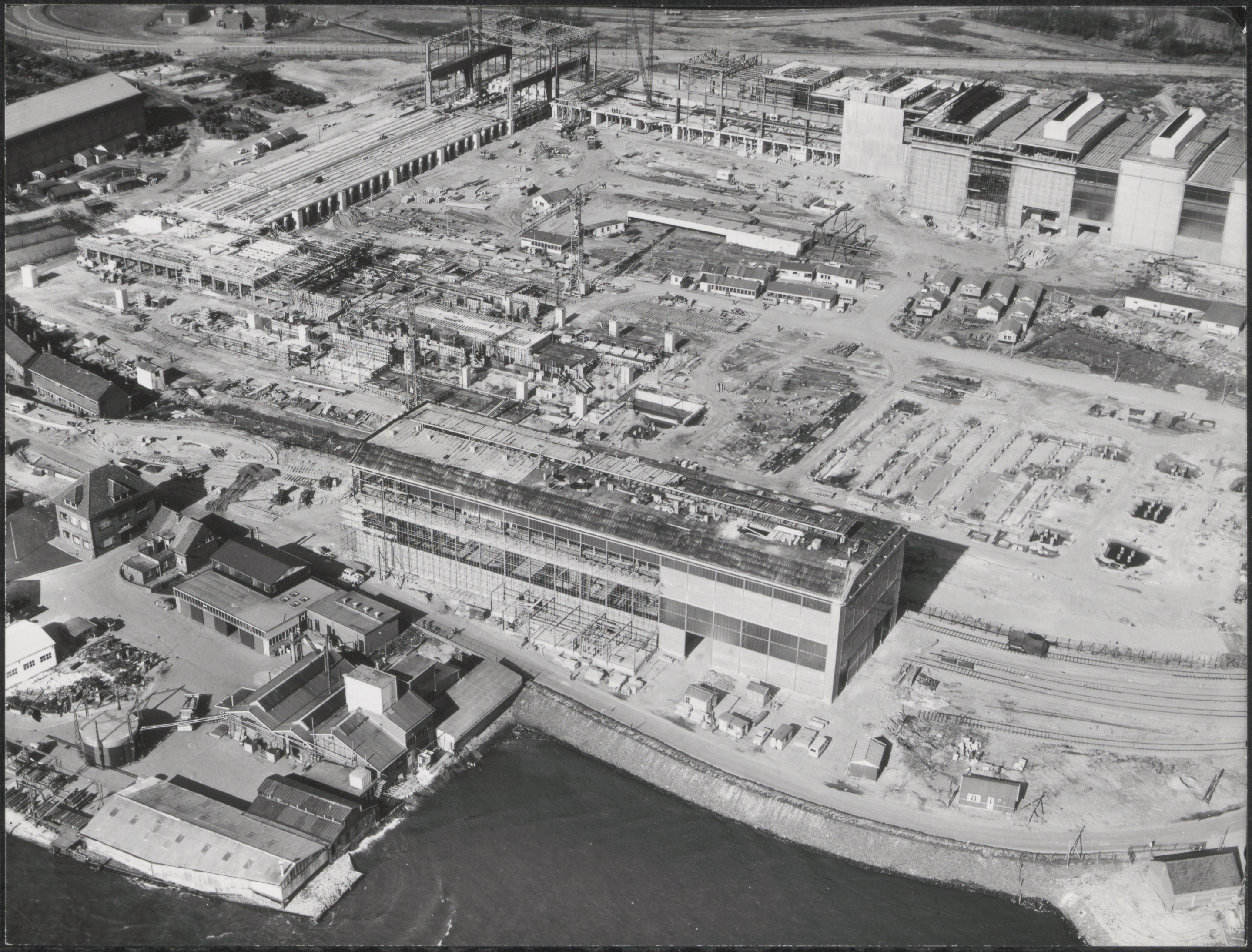 - Luchtfoto van nieuwbouw op het terrein van de kabelfabriek in Alblasserdam. Linksonder zuurstoffabriek De Alblas.