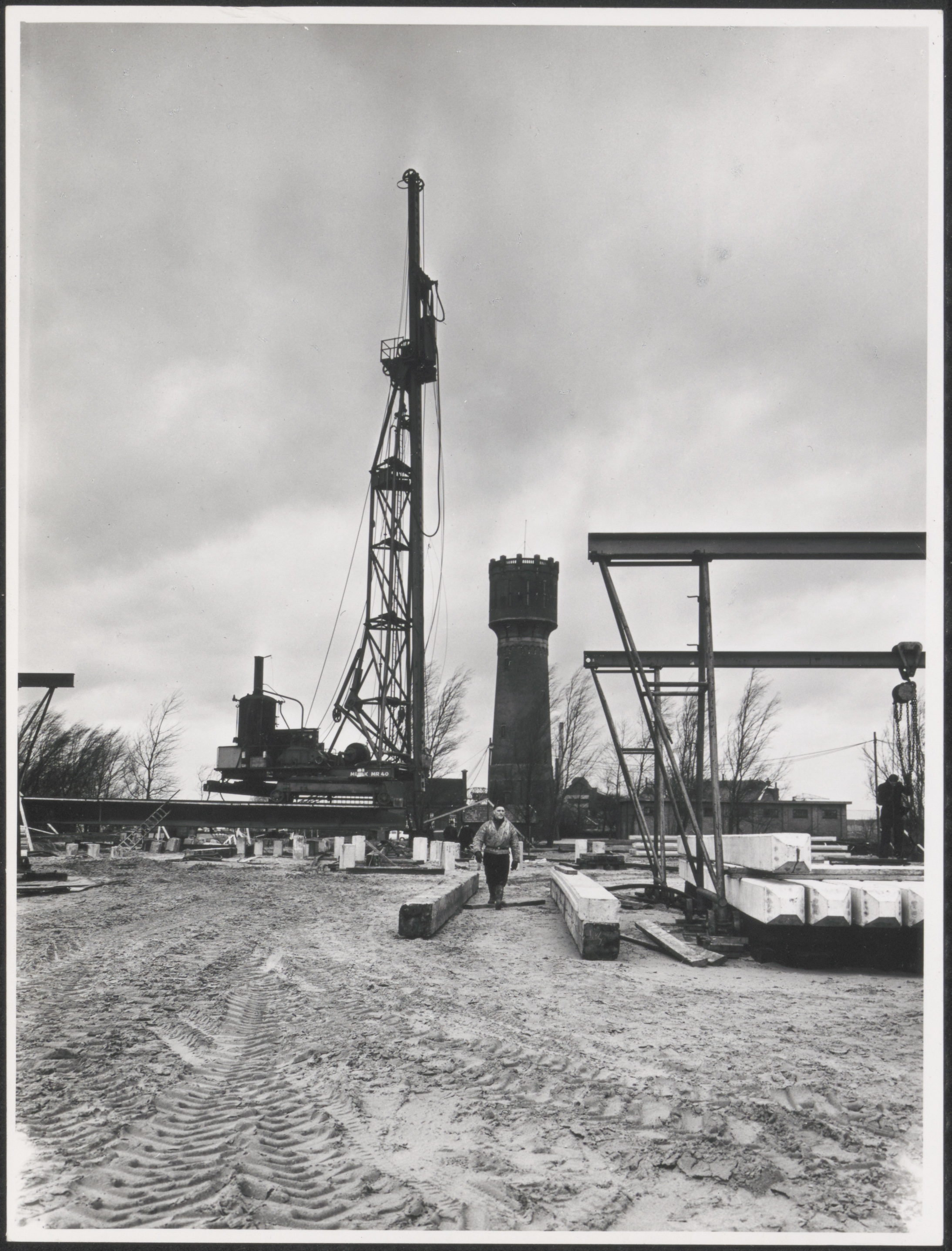 Heiwerkzaamheden voor nieuwbouw van de zgn. blokstraat van de kabelfabriek in Alblasserdam. Op de achtergrond de watertoren.